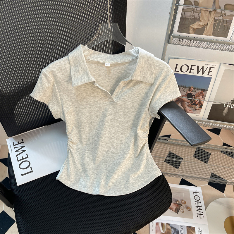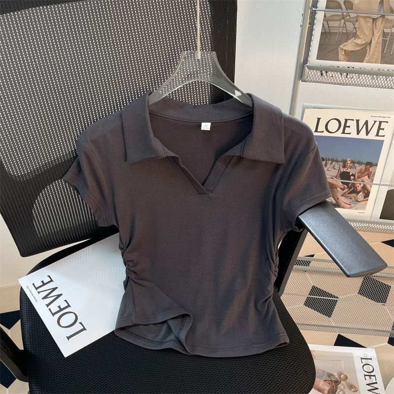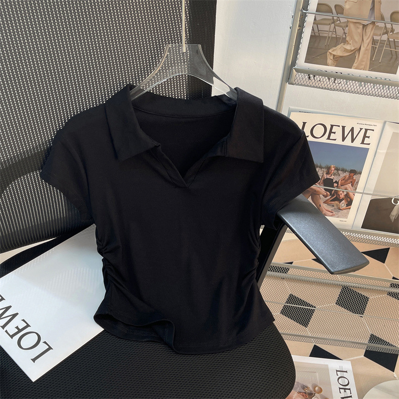 正肩短袖T恤女夏季修身褶皱显瘦短款polo衫翻领V领不规则体桖上衣