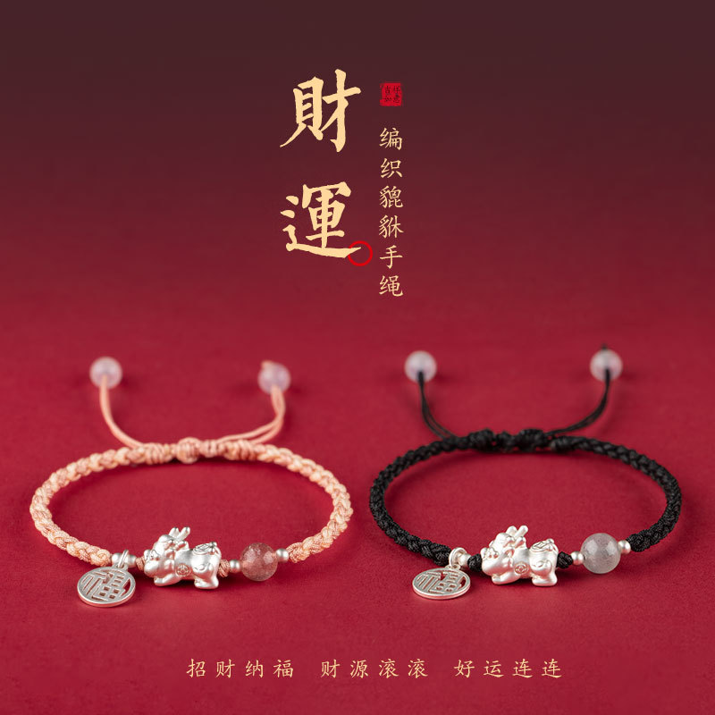 纯手工编织铜镀银貔貅红绳手绳情侣手链男女款吞金兽情人节礼物