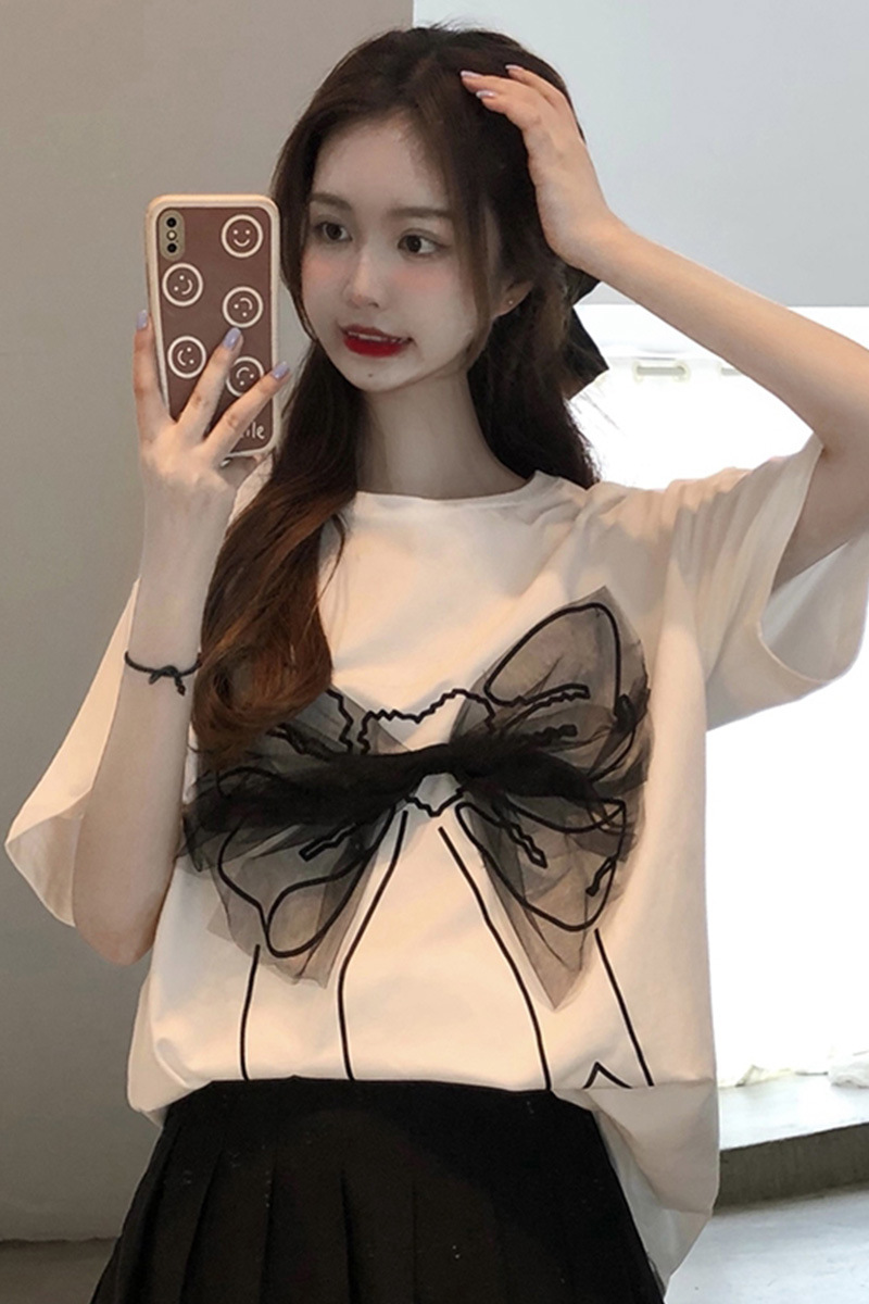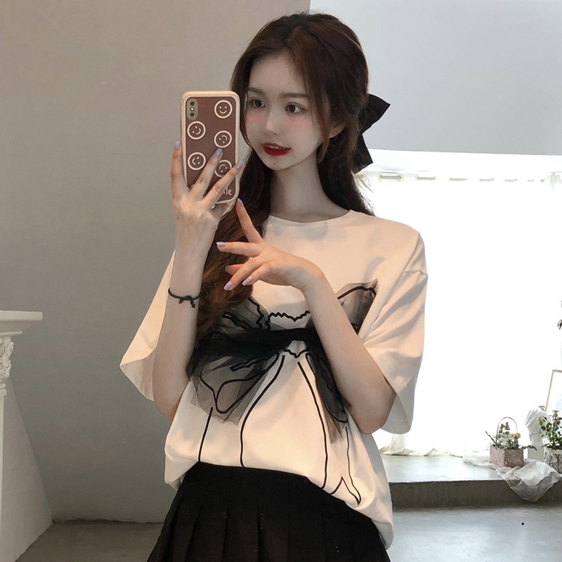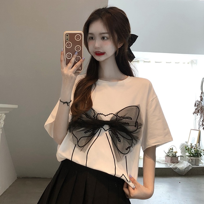 短袖t恤女设计感小众夏季新款网纱蝴蝶结别致纯棉半袖宽松上衣ins