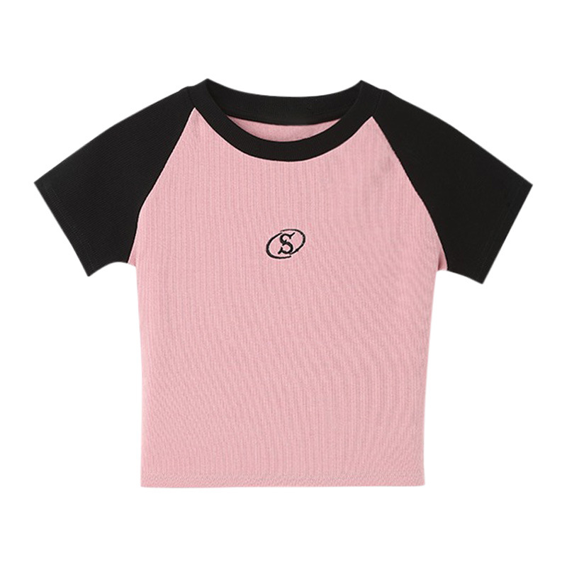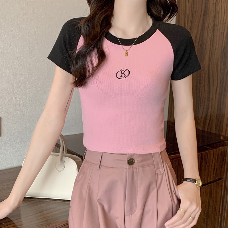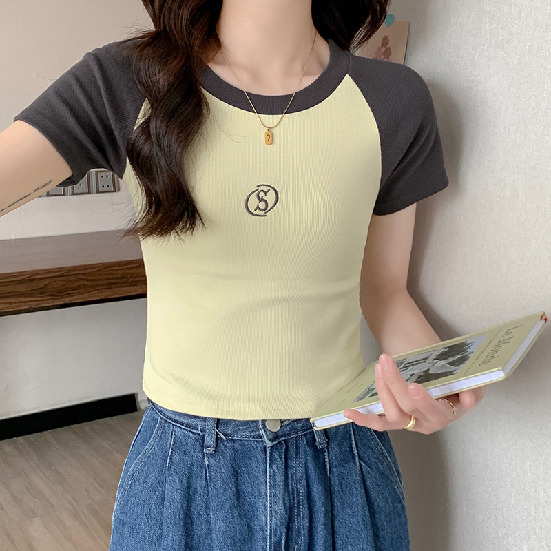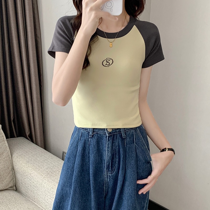 辣妹紧身拼色正肩短袖T恤女纯棉上衣夏季小众设计感圆欲短款体桖