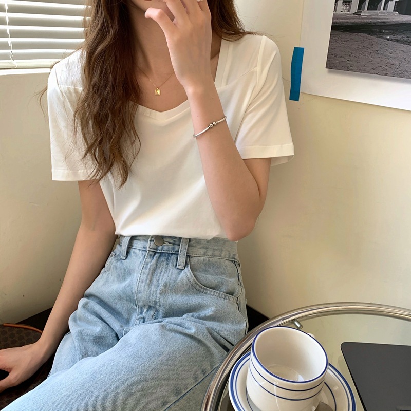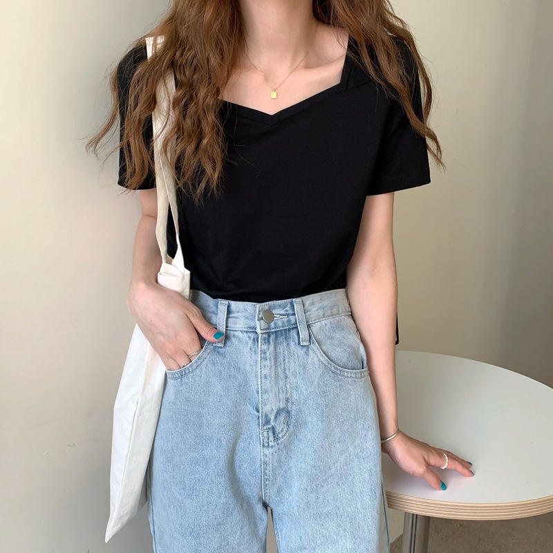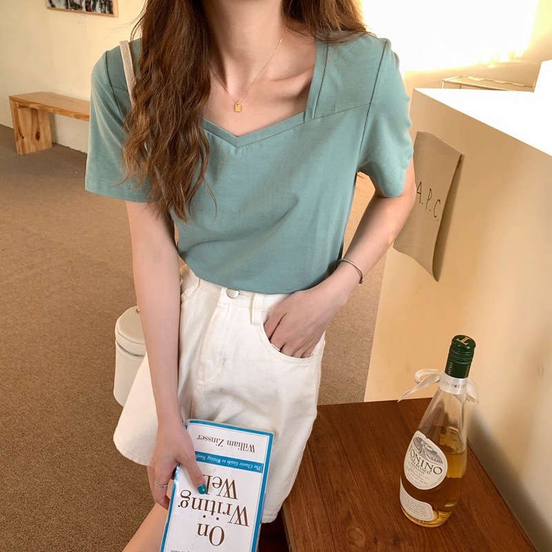 法式方领露锁骨v领纯棉短袖t恤女夏季新款宽松设计感小心机上衣服