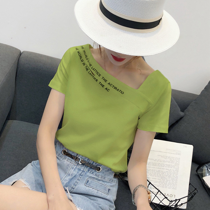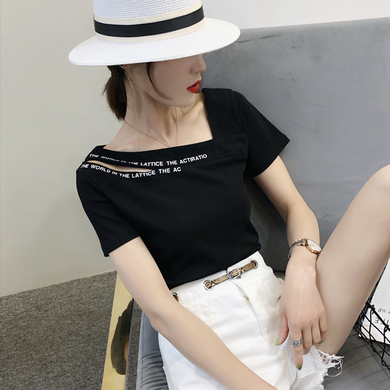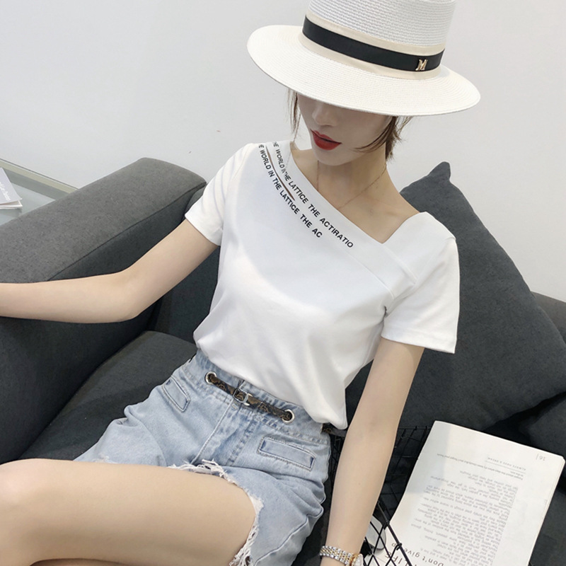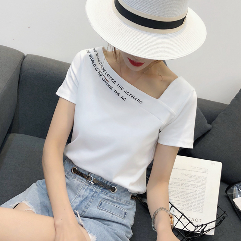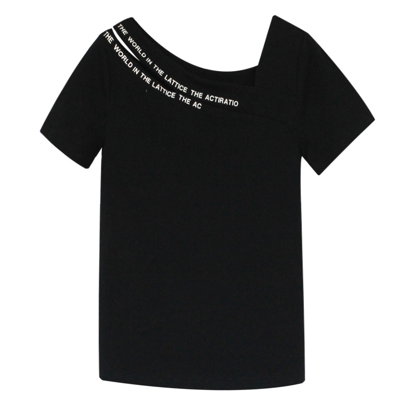 短袖T恤女修身显瘦设计感夏季新款斜肩镂空字母不规则纯棉上衣潮