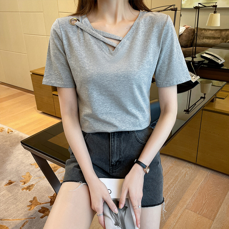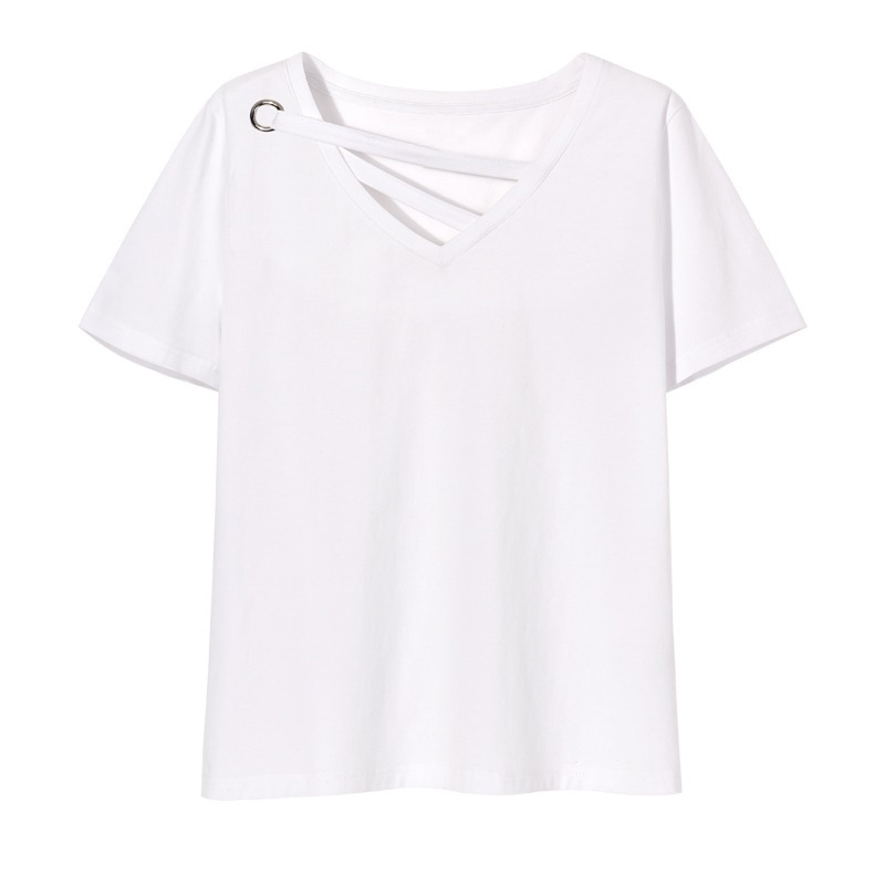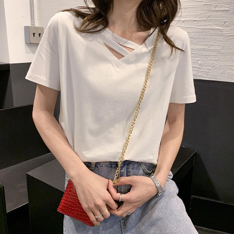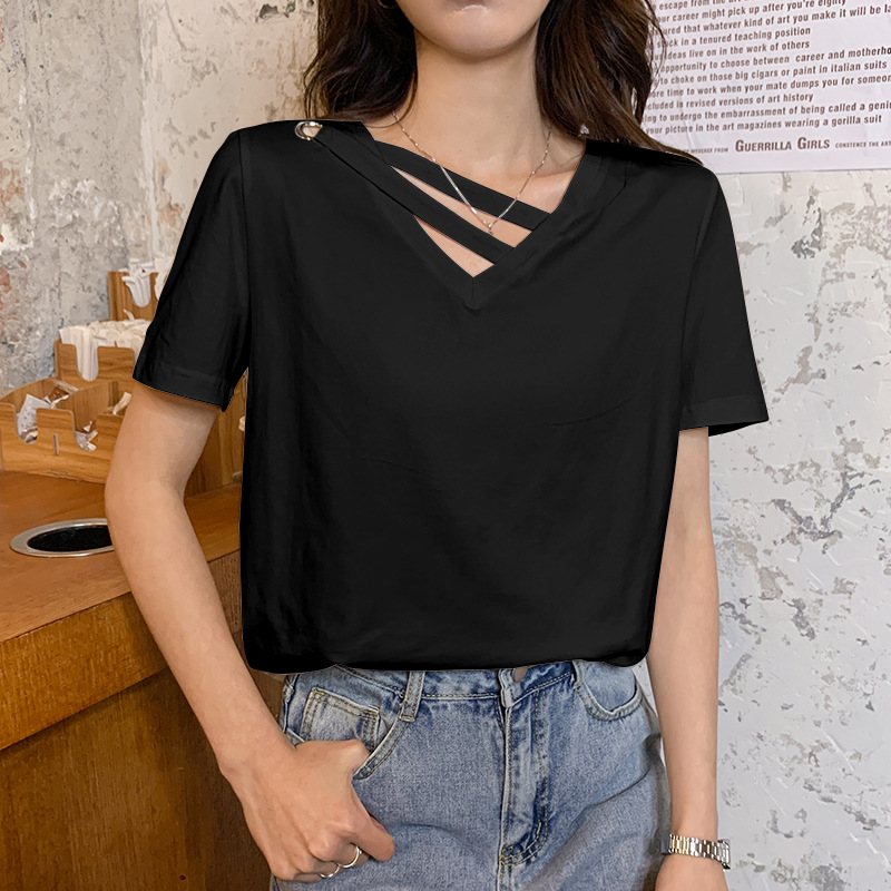 黑色短袖t恤女年夏季新款交叉v领设计感小众纯棉宽松体桖上衣