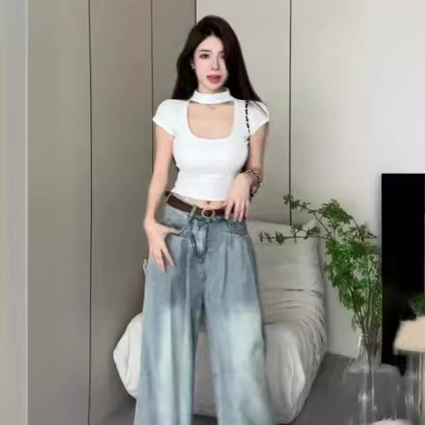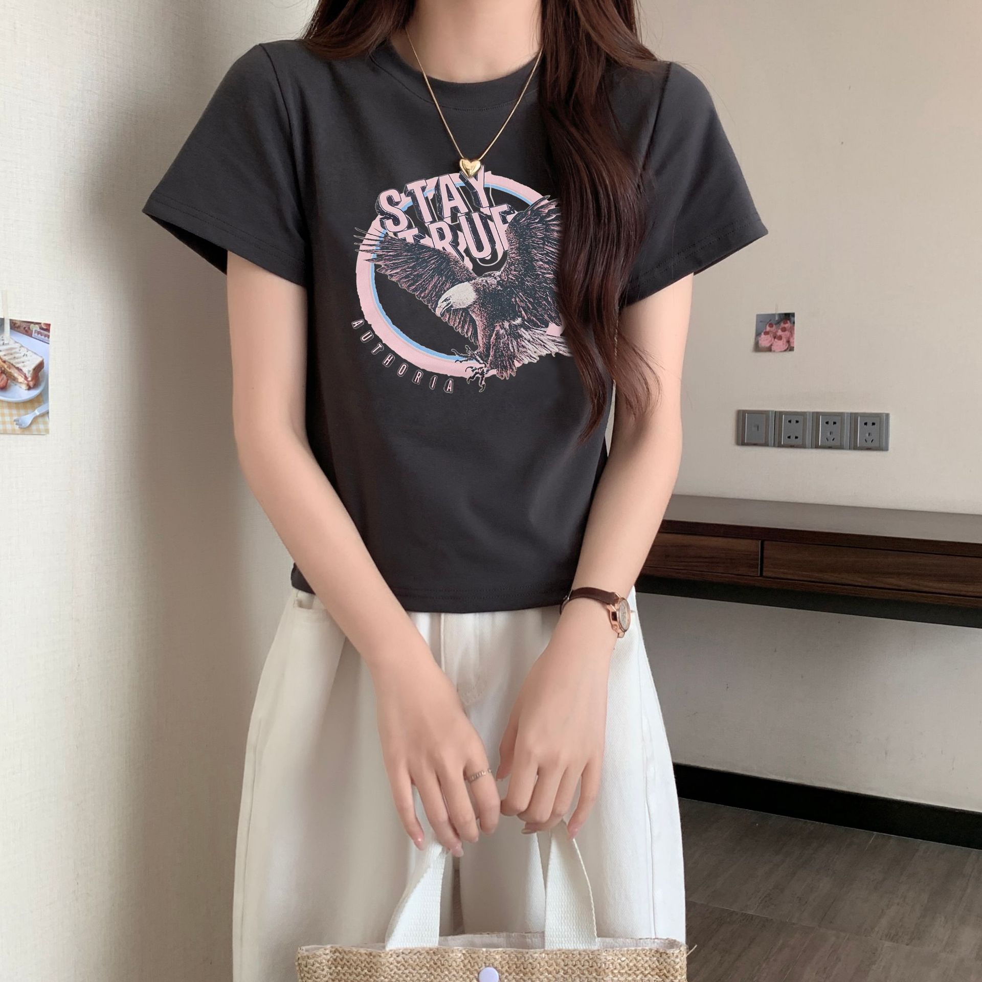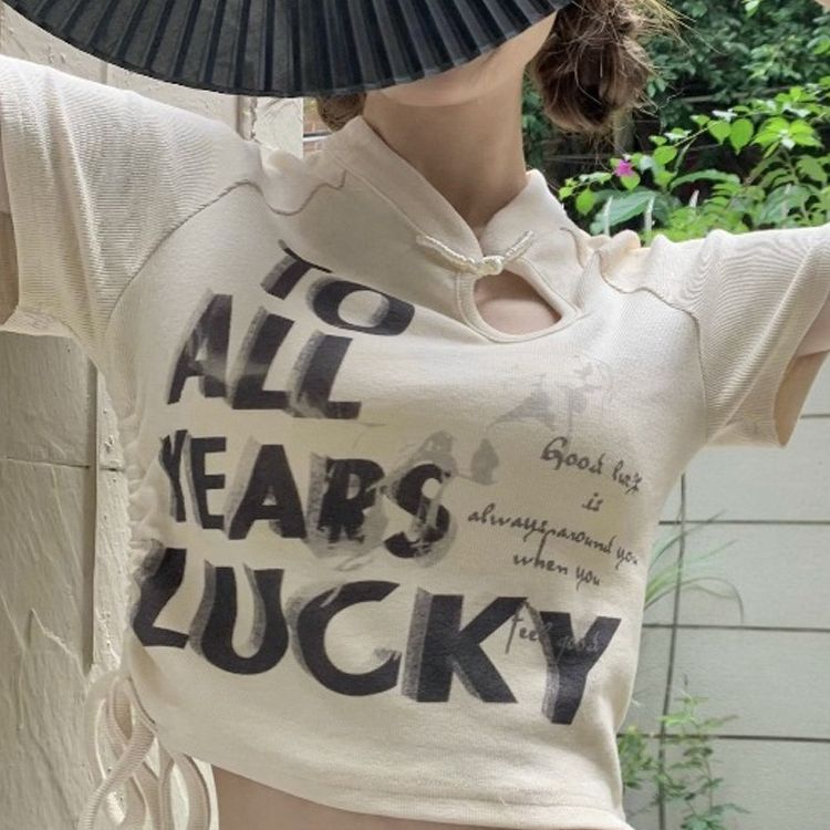 冰丝螺纹国潮复古甜酷辣妹印花抽绳设计短款T恤女学生镂空修身