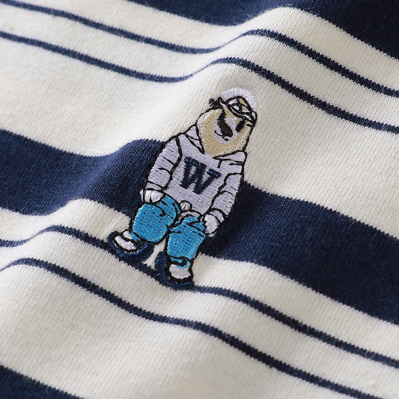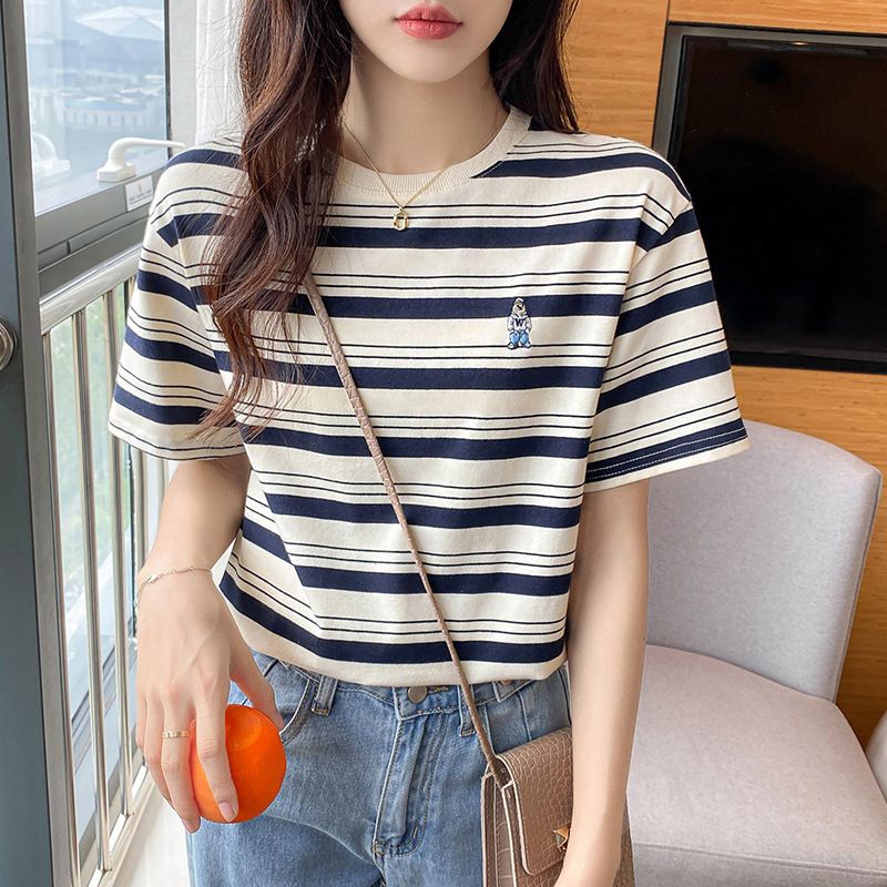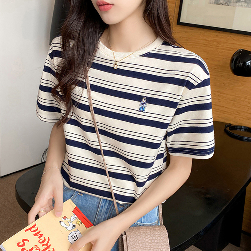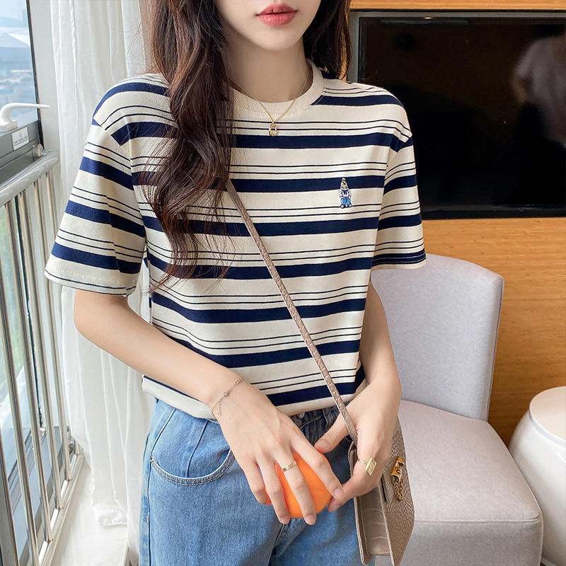 条纹正肩短袖T恤女夏季撞色设计感小众显瘦纯棉体桖刺绣宽松上衣