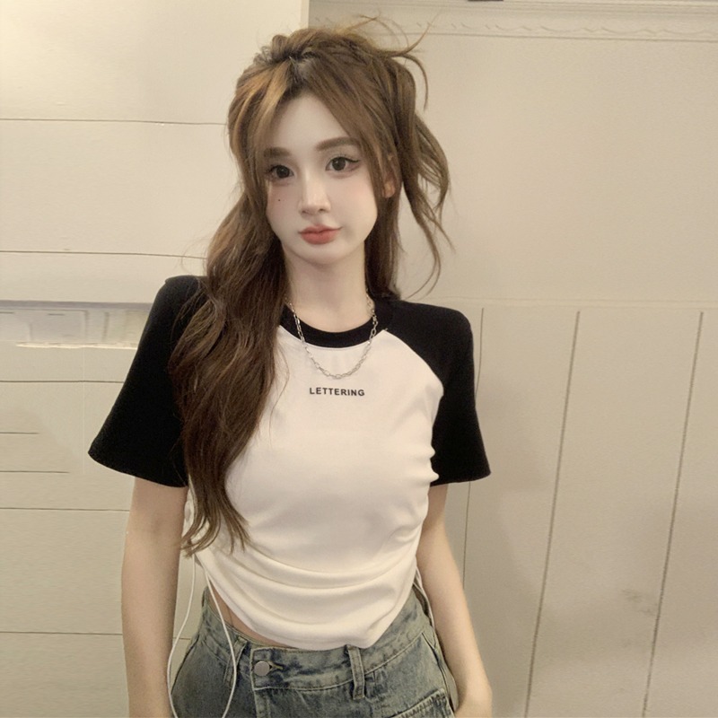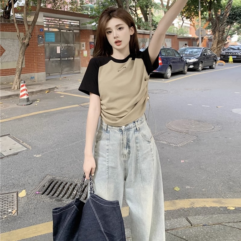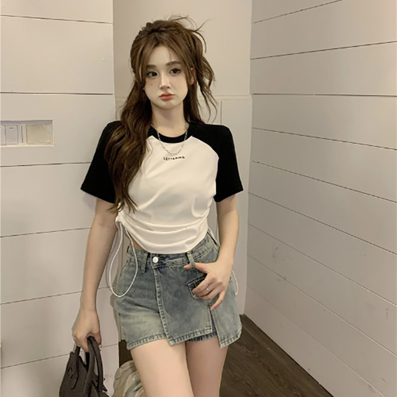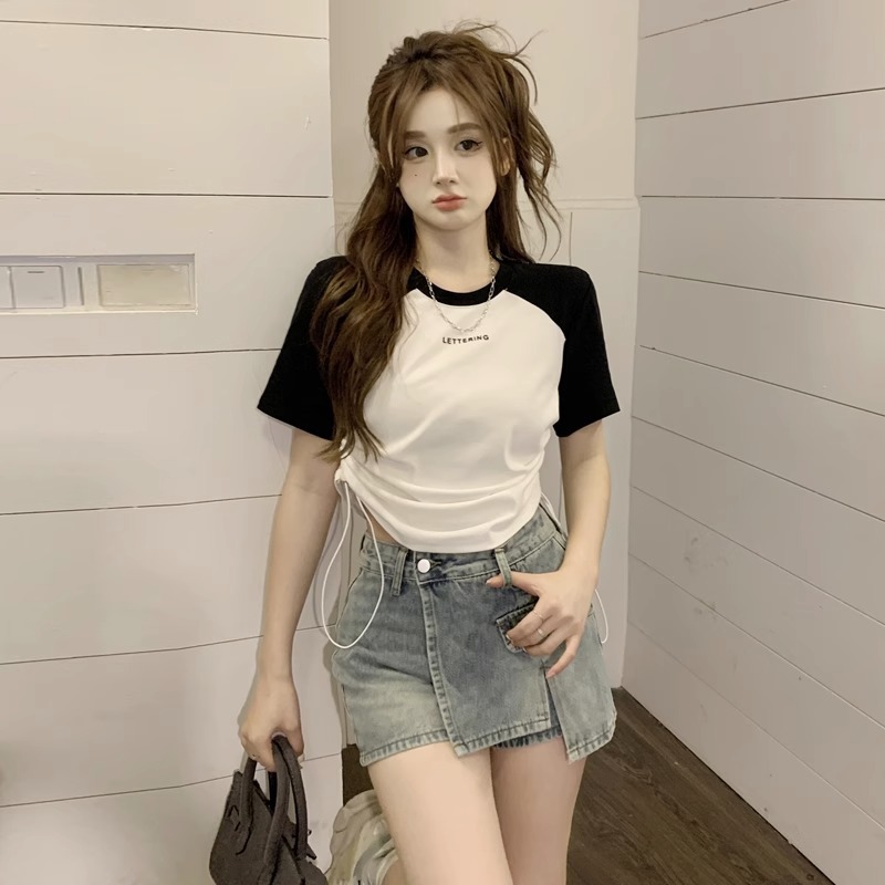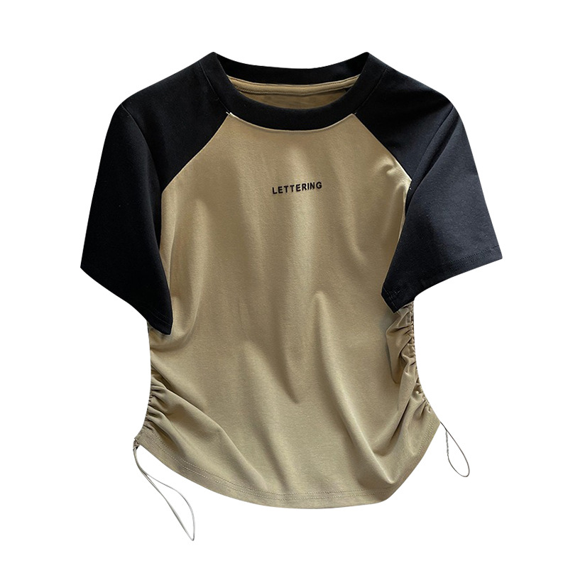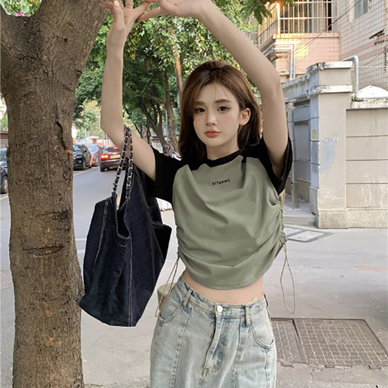 短袖T恤女设计感小众夏季新款修身抽绳收腰显瘦纯棉体桖上衣