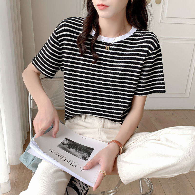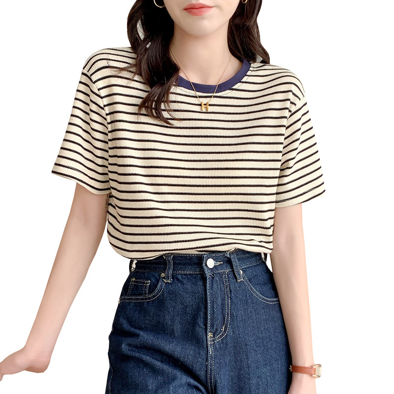 条纹t恤女夏季新款华夫格纯棉短袖宽松设计感小众短款正肩上衣ins