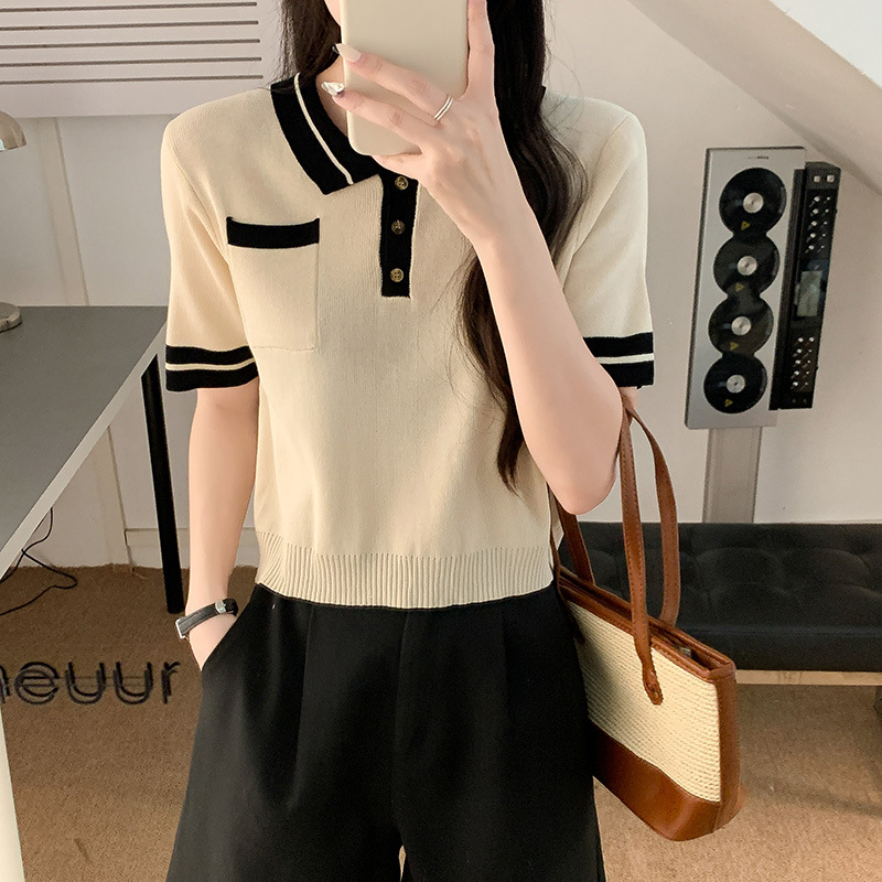 正肩短袖冰丝针织衫女夏季新款高腰短款polo领t恤宽松上衣ins超火