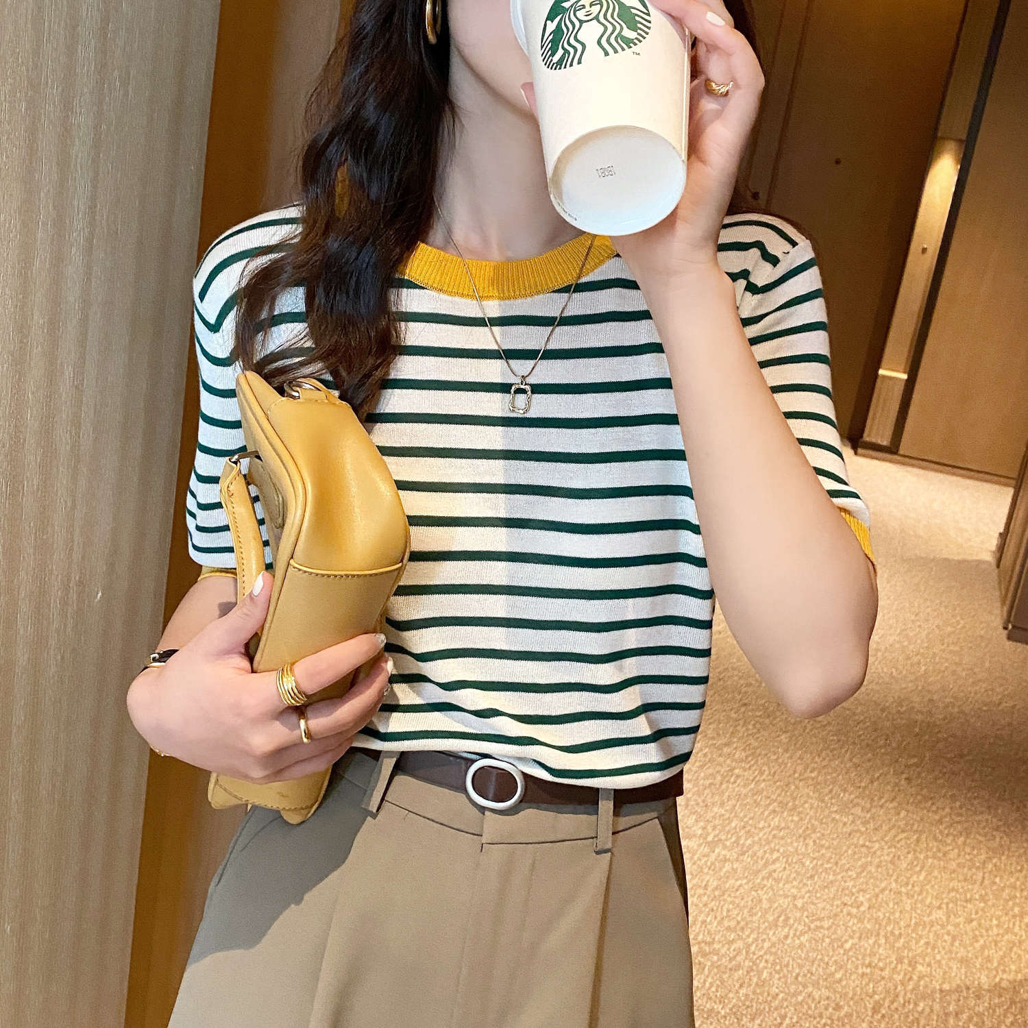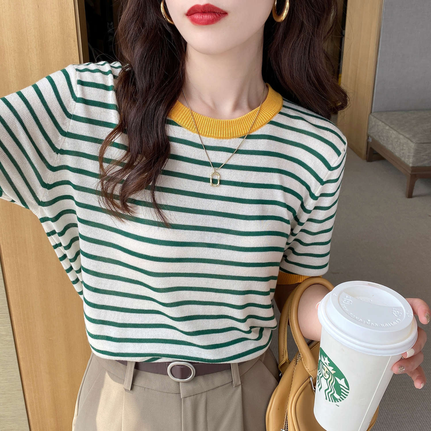 冰丝针织衫短袖女夏季薄款设计感小众宽松撞色条纹t恤半袖上衣服
