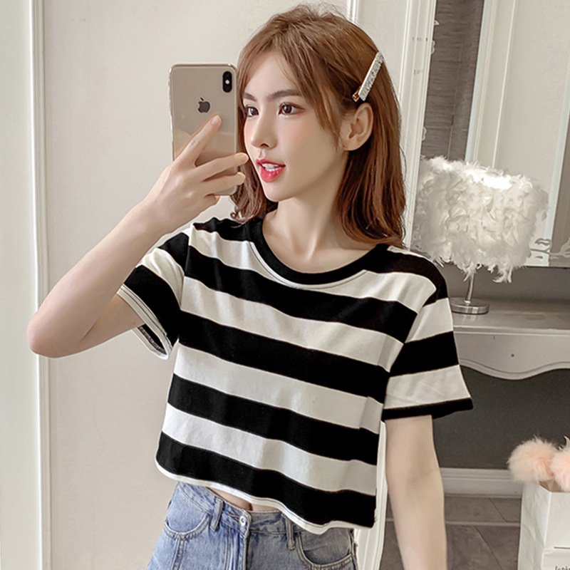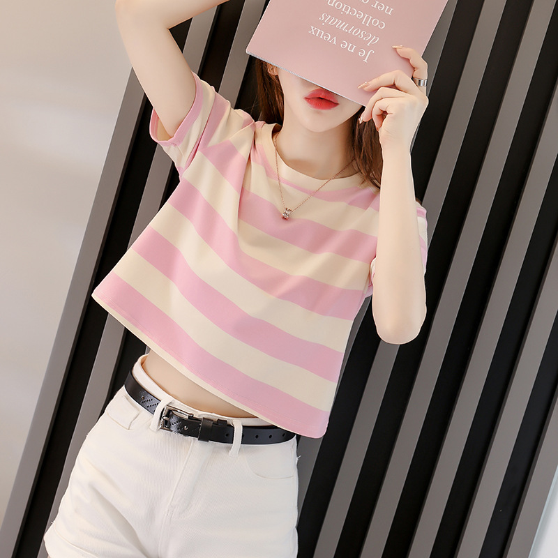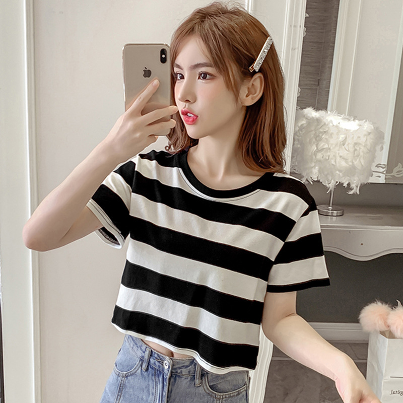 纯棉条纹短袖t恤女夏季新款韩版宽松设计感小众高腰短款上衣ins潮