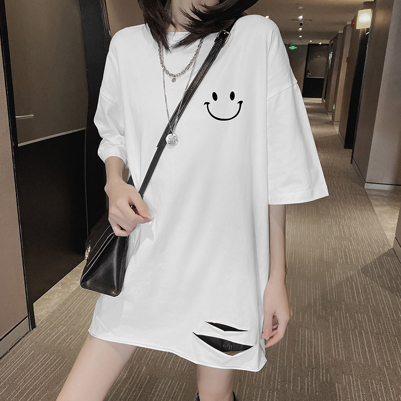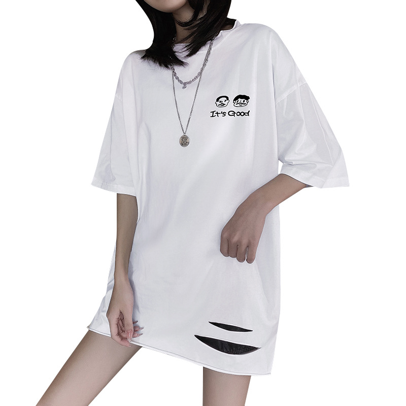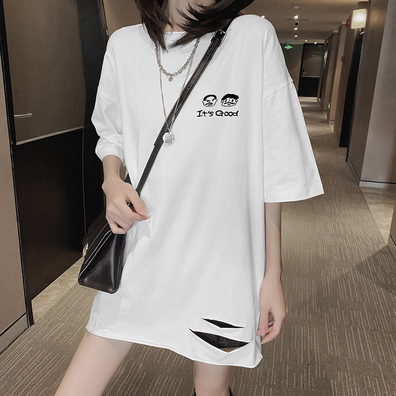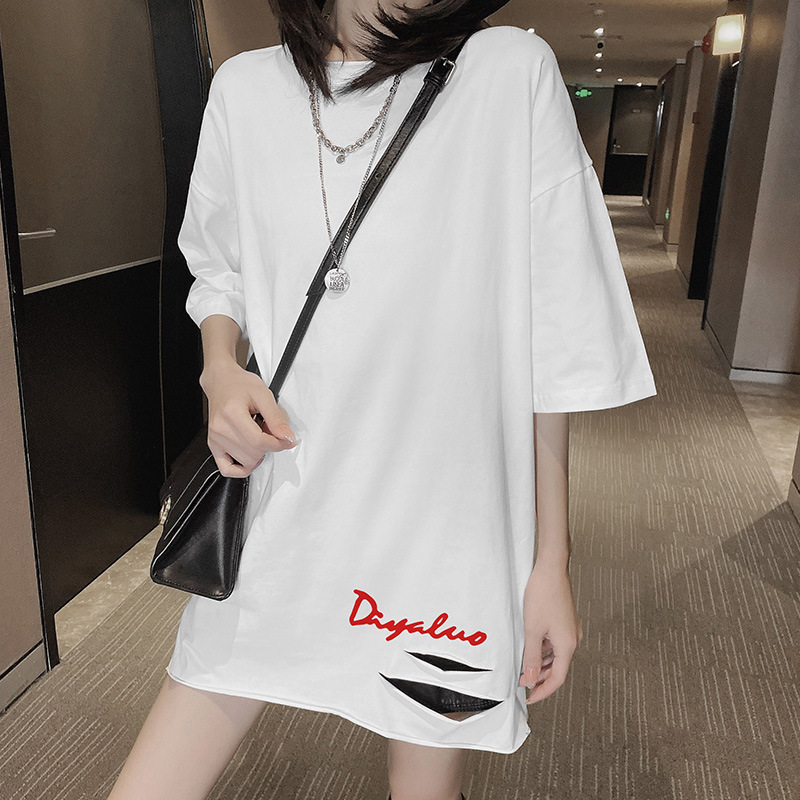 纯棉中长款短袖T恤女宽松夏季新款破洞开叉圆领卷边印花上衣