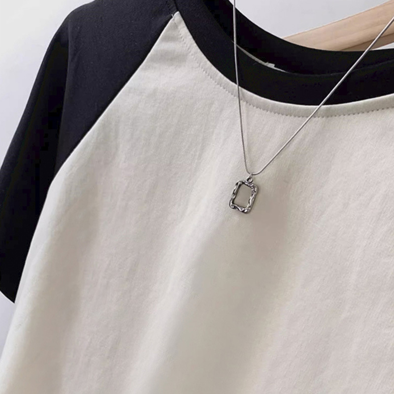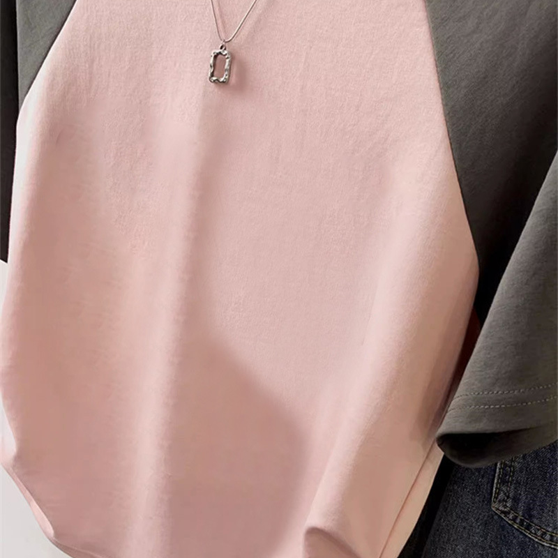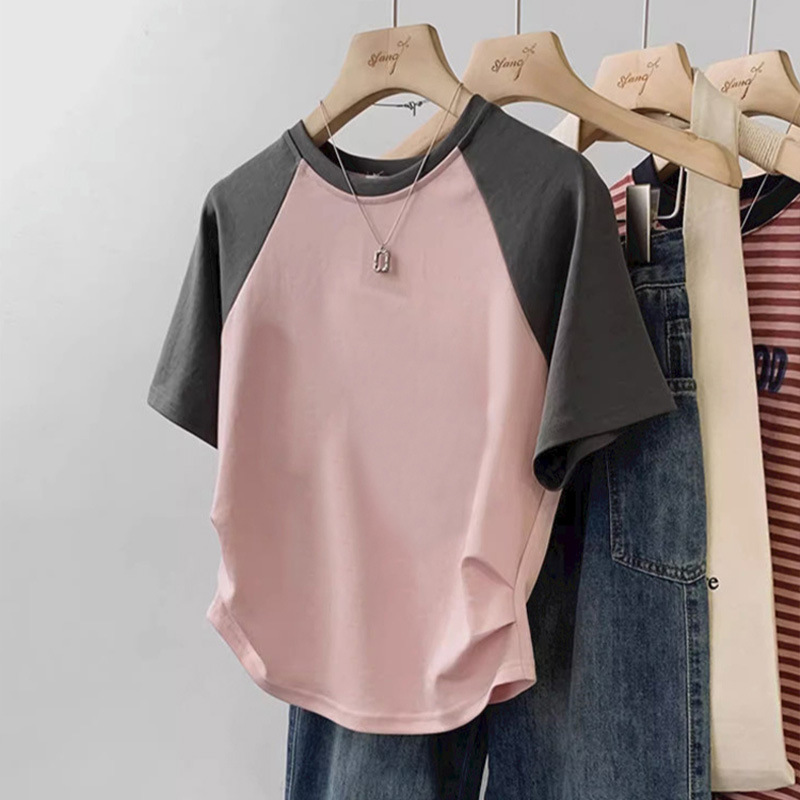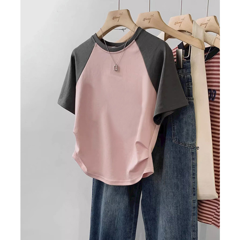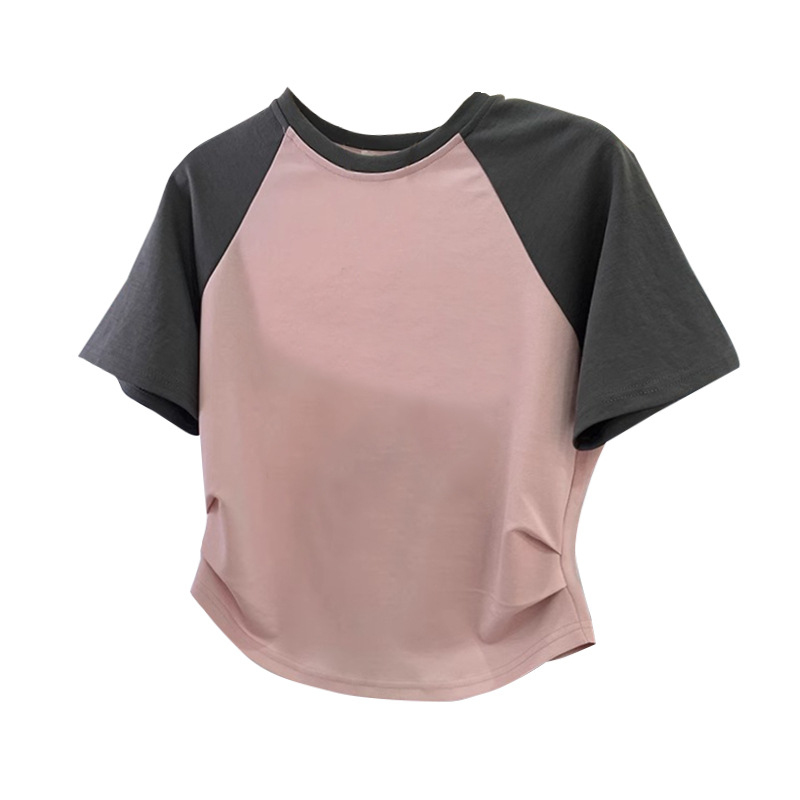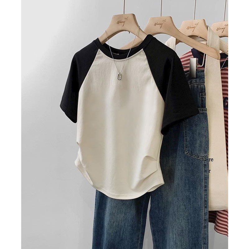 撞色短袖t恤女夏季新款插肩袖设计感侧边褶皱宽松体桖上衣服ins潮