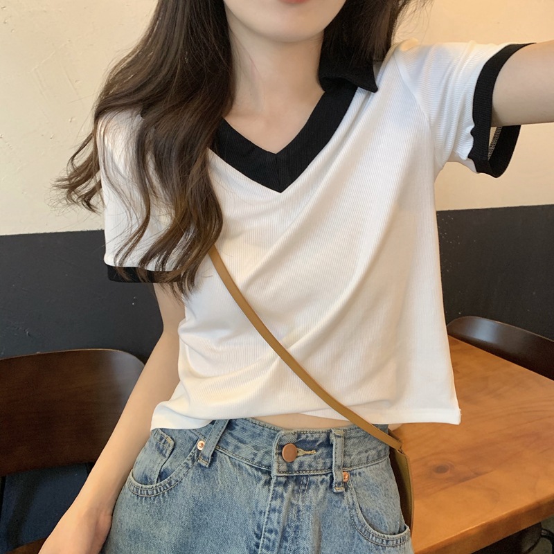 polo衫v领短袖T恤女夏季新款设计感小众撞色高腰短款正肩纯棉上衣