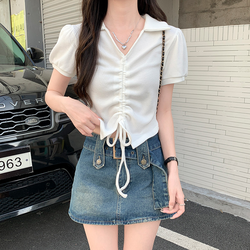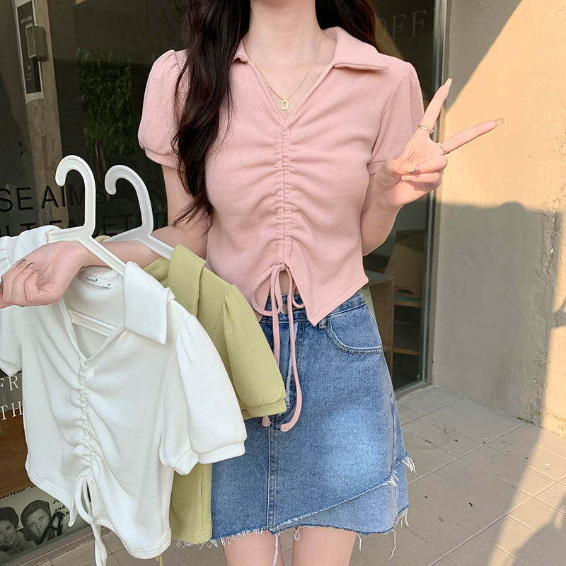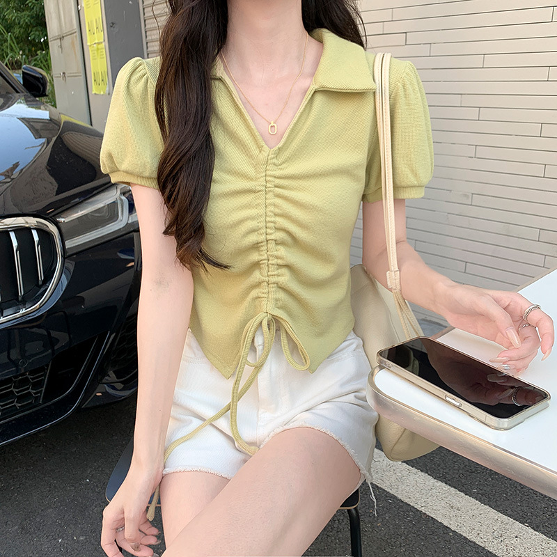 纯欲甜辣妹V领短袖T恤女夏季新款设计感小众泡泡袖短款polo领上衣