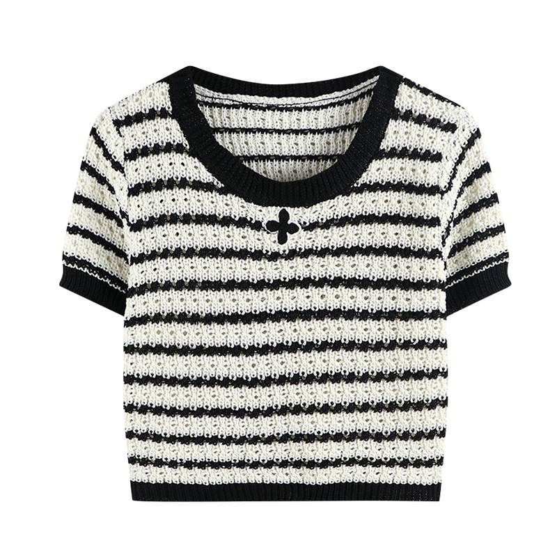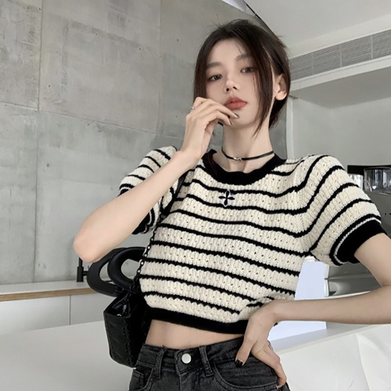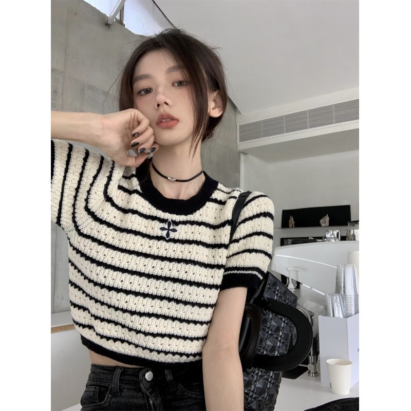 薄款镂空短袖条纹针织衫女法式设计感高腰短款宽松冰丝T恤上衣夏