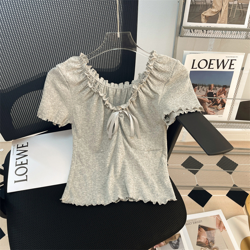 V领花边芭蕾风T恤女夏季新款显瘦抽绳设计感小众半袖短款纯欲上衣