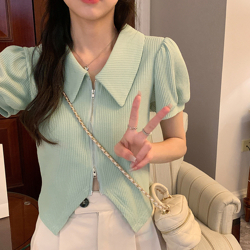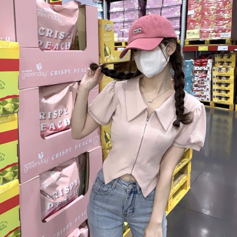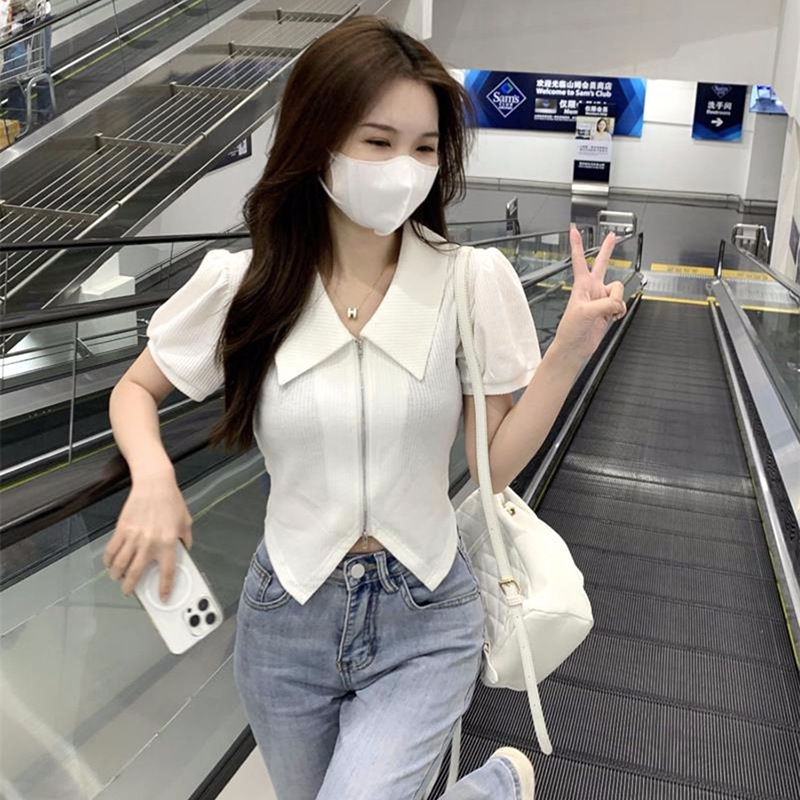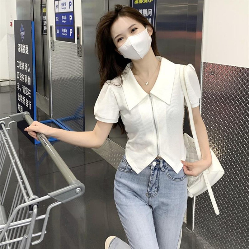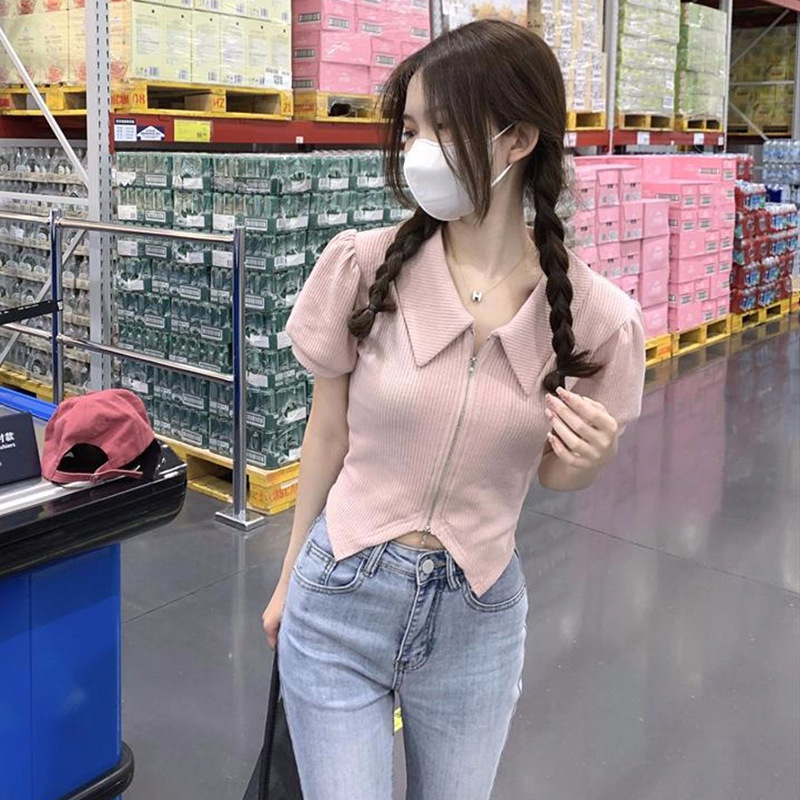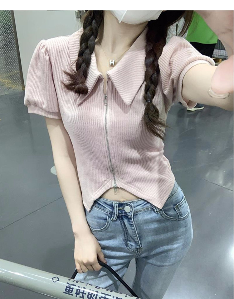 polo领华夫格棉短袖T恤女设计感小众别致短款拉链开衫上衣小衫夏