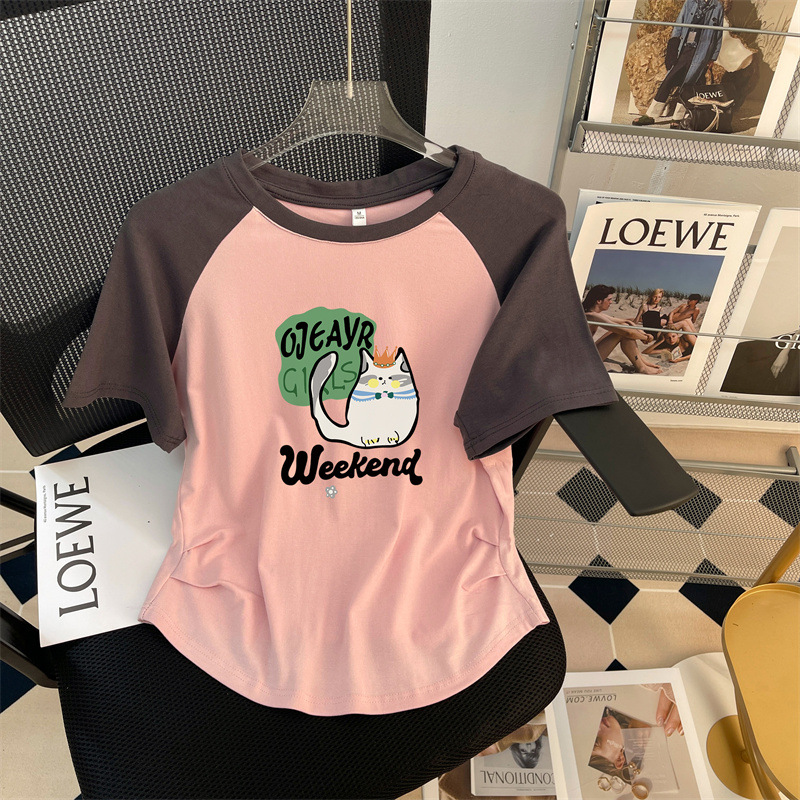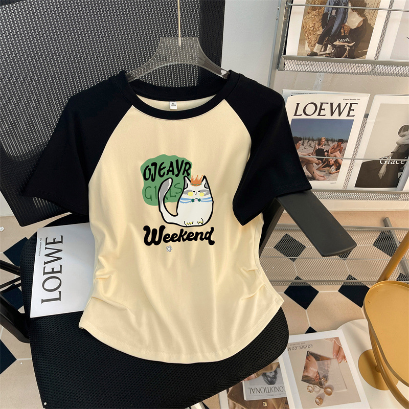 插肩袖T恤女收腰显瘦短款上衣夏季宽松韩版美式复古撞色短袖体桖