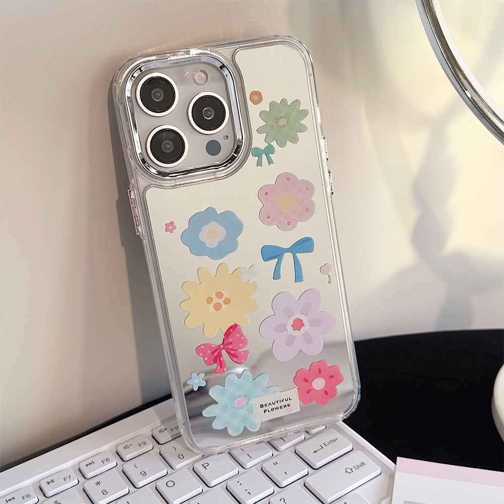 彩色蝴蝶结花朵镜子适用iPhone15ProMax苹果14/13/12手机壳少女心