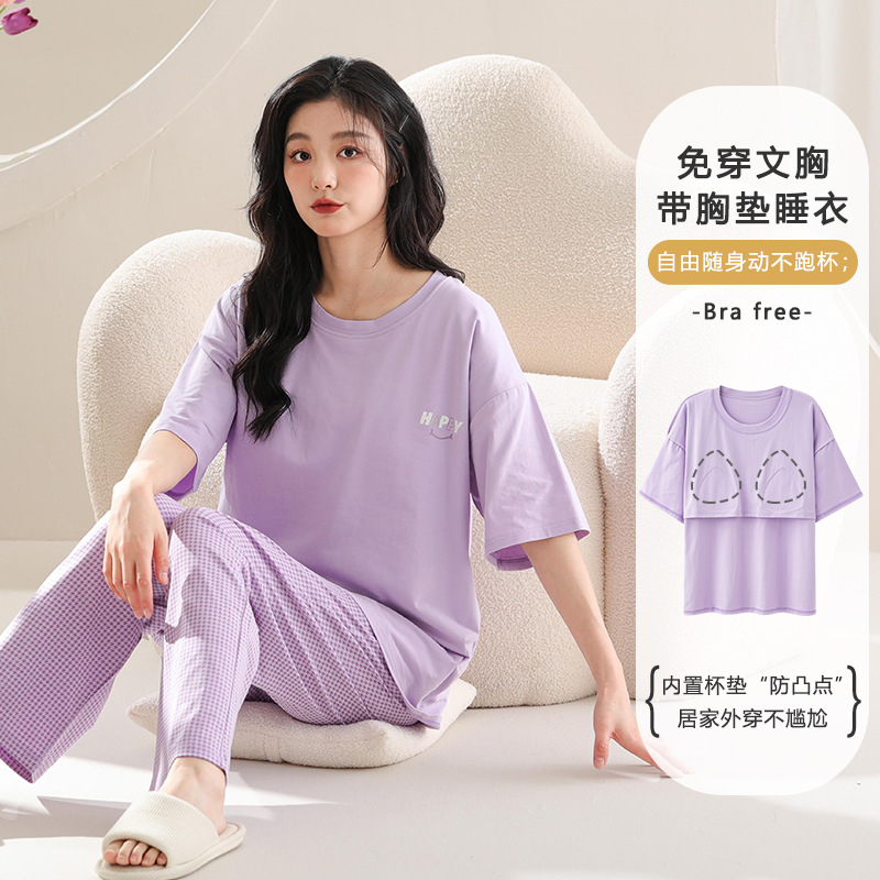 莫代尔睡衣女士夏季短袖长裤新款套头带胸垫一体家居服套装