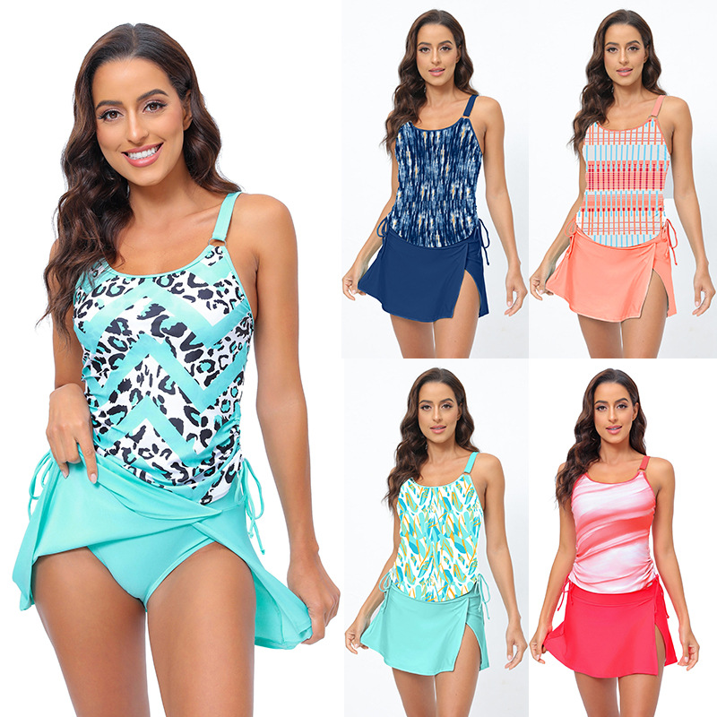 【欧美裙式三件套泳衣女】时尚印花抽绳坦基尼独立三角底裤女泳装