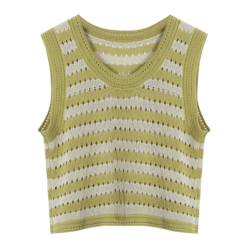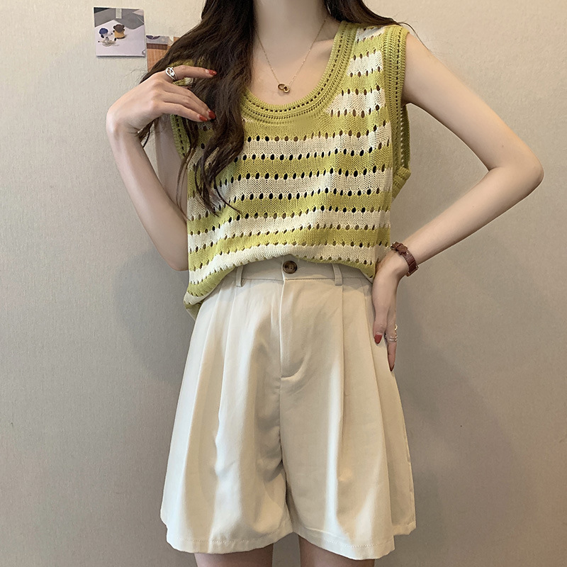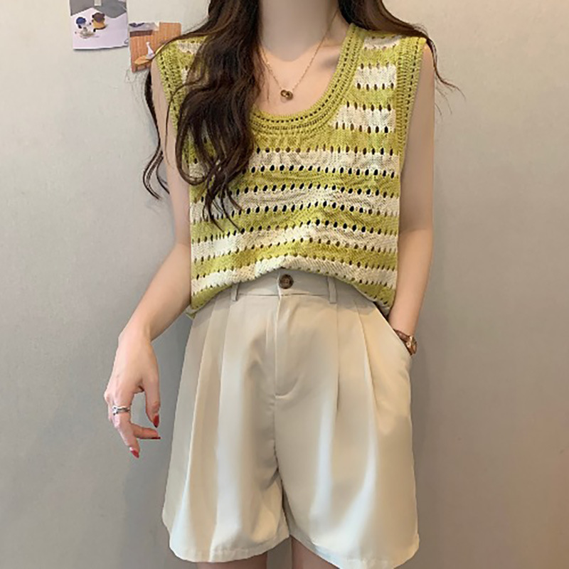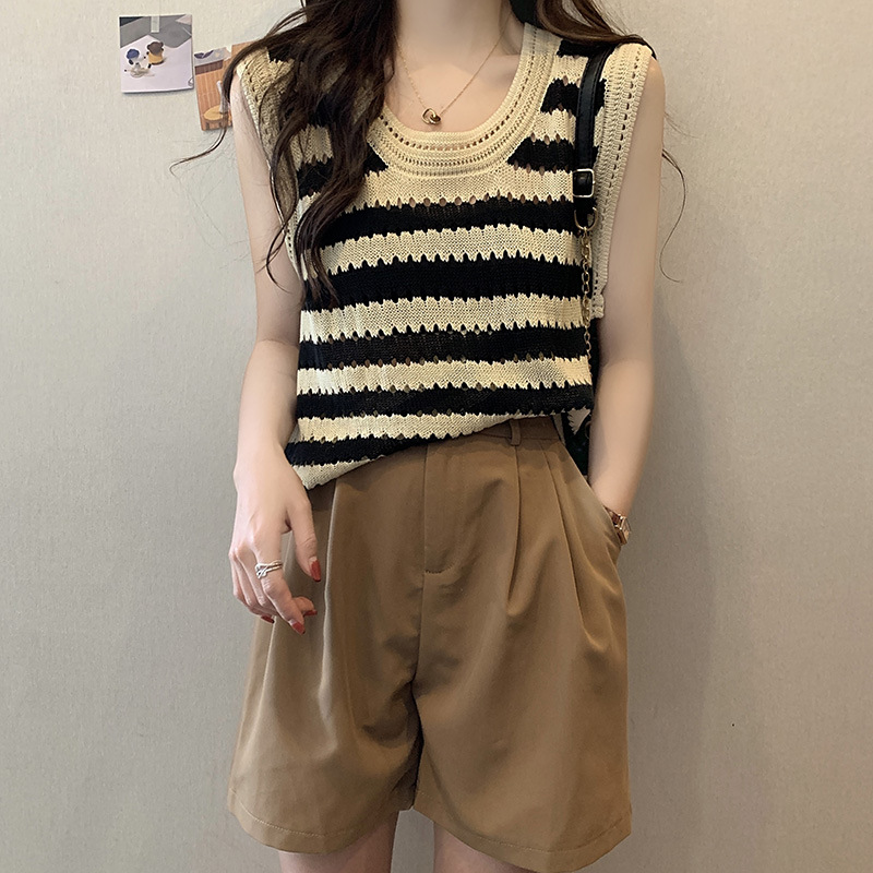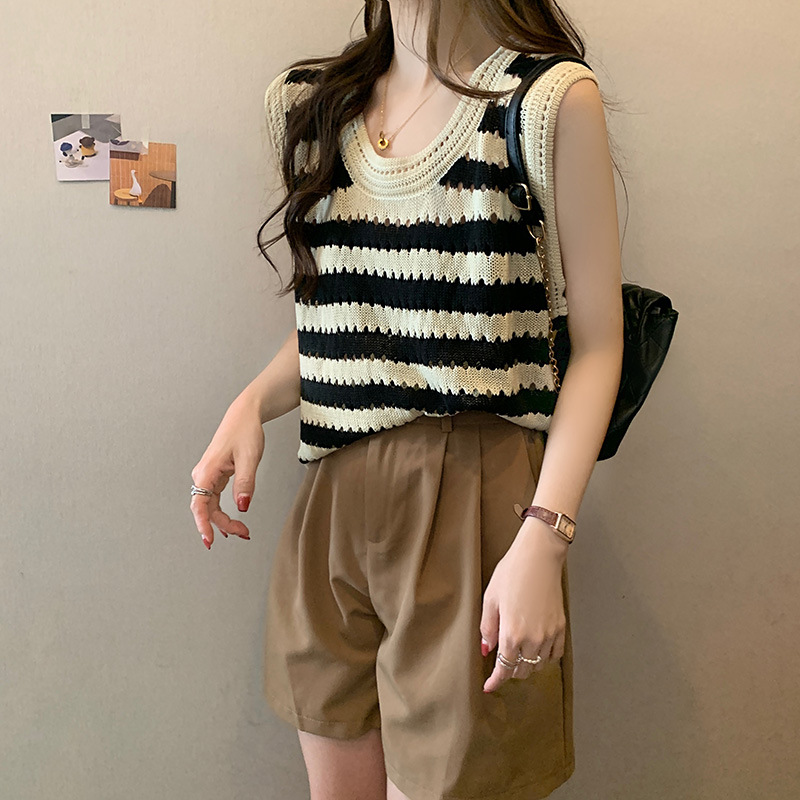 针织条纹坎肩背心女夏外穿纯欲甜辣妹美式复古无袖polo领上衣t恤