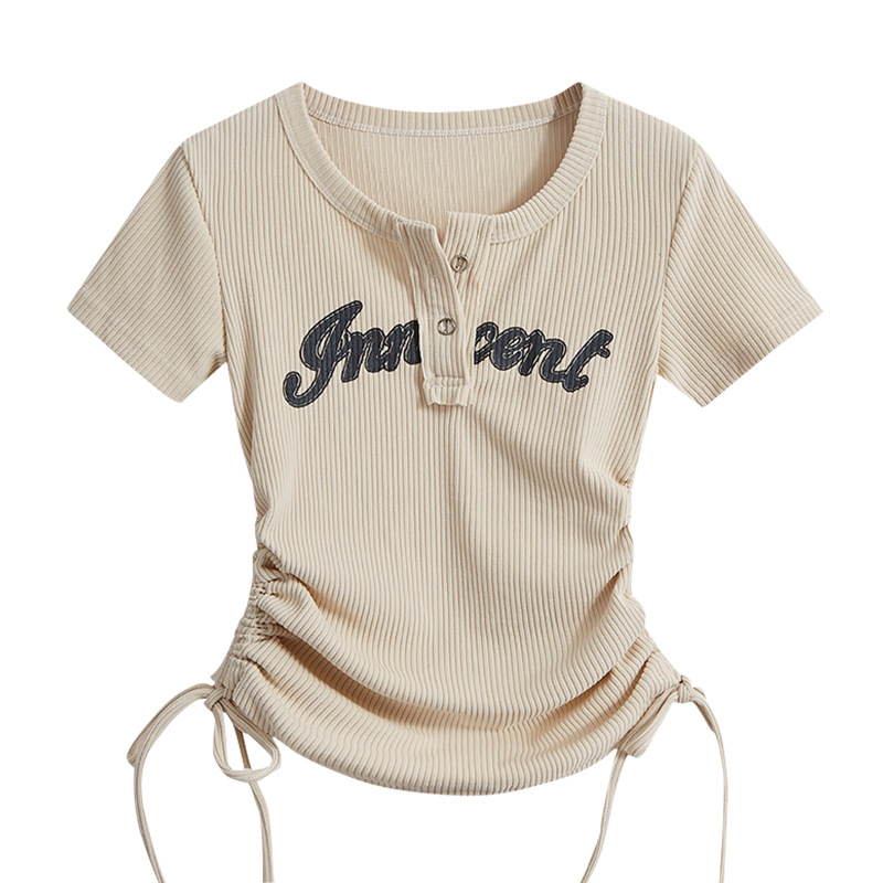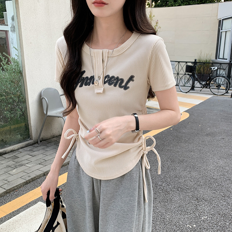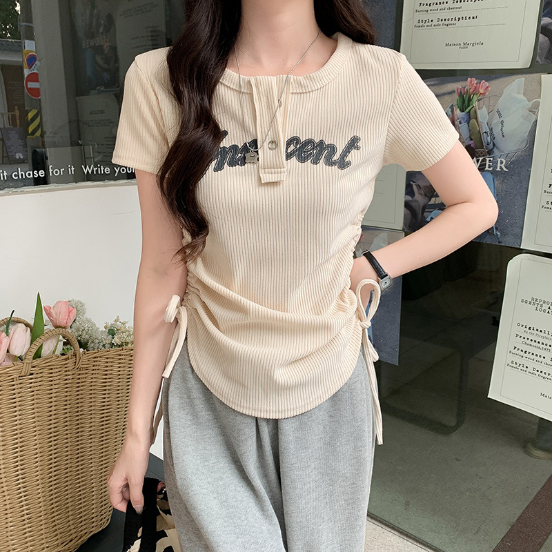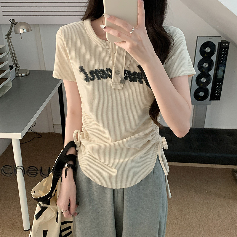 正肩短款抽绳短袖T恤女设计感小众夏季辣妹小个子针织坑条上衣桖