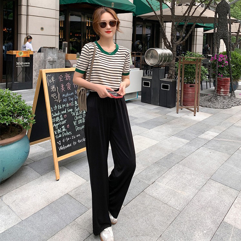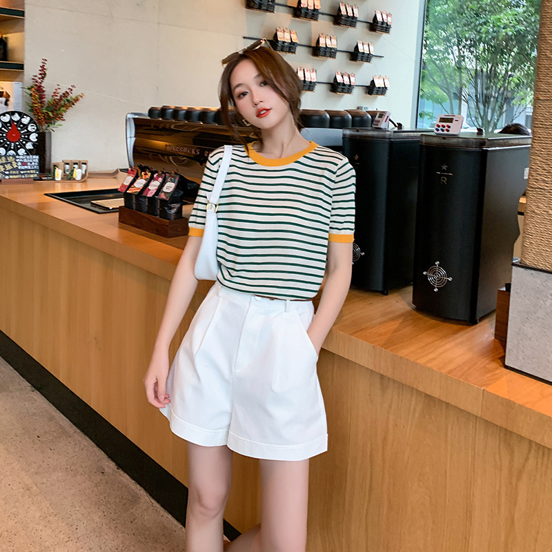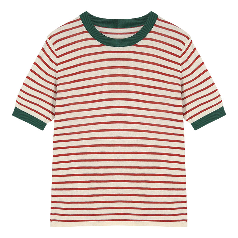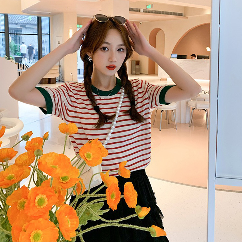 夏季薄款冰丝针织衫短袖女设计感小众宽松撞色条纹t恤半袖上衣服