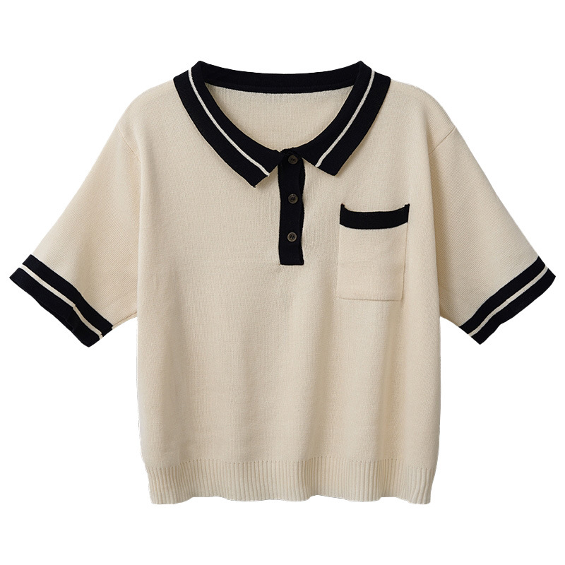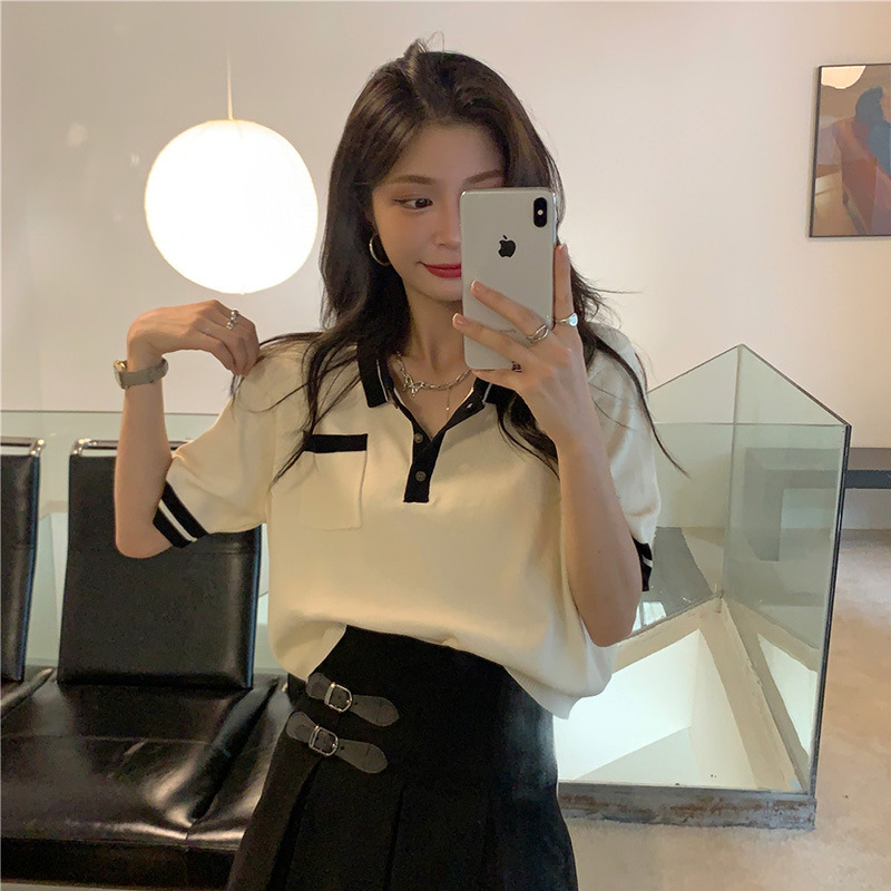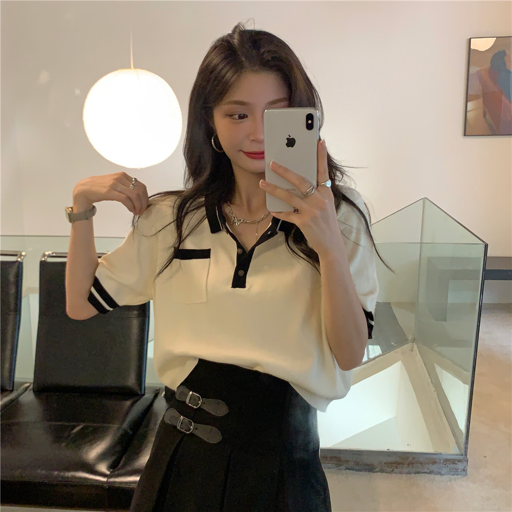 宽松polo领t恤短袖冰丝针织衫女夏季新款高腰短款正肩上衣ins超火