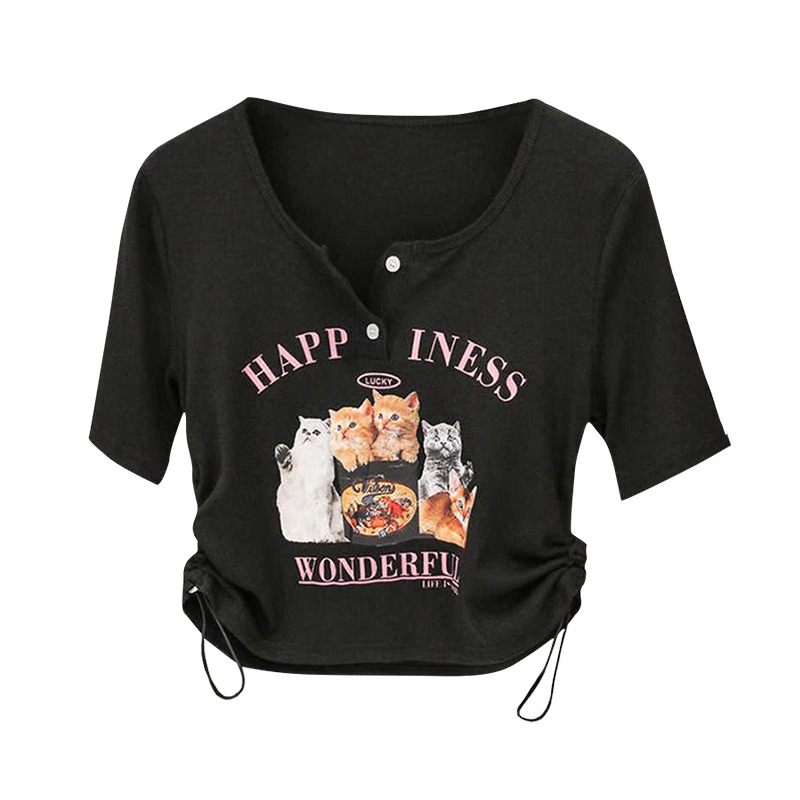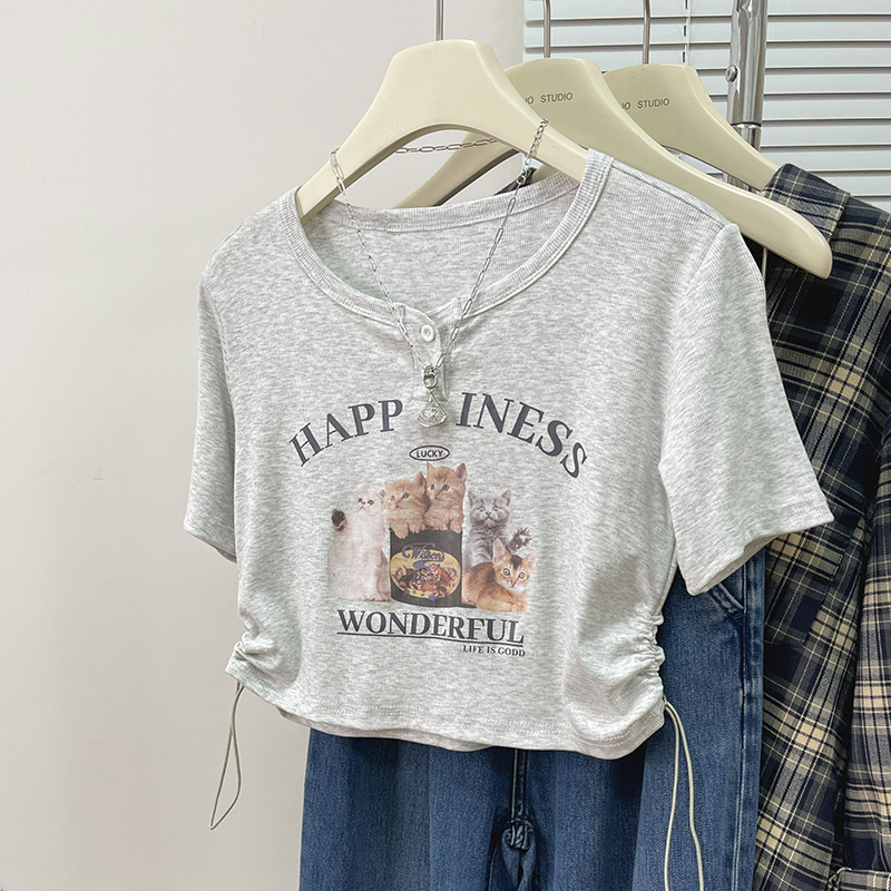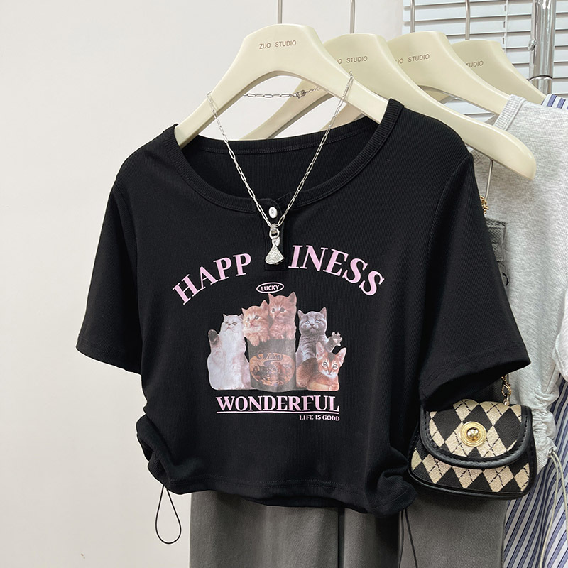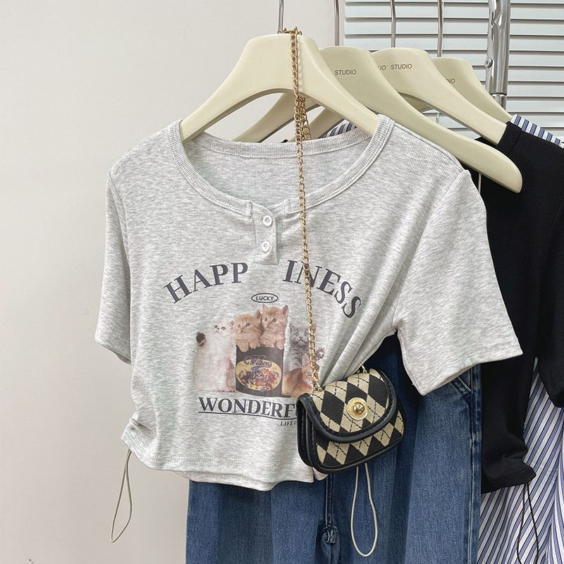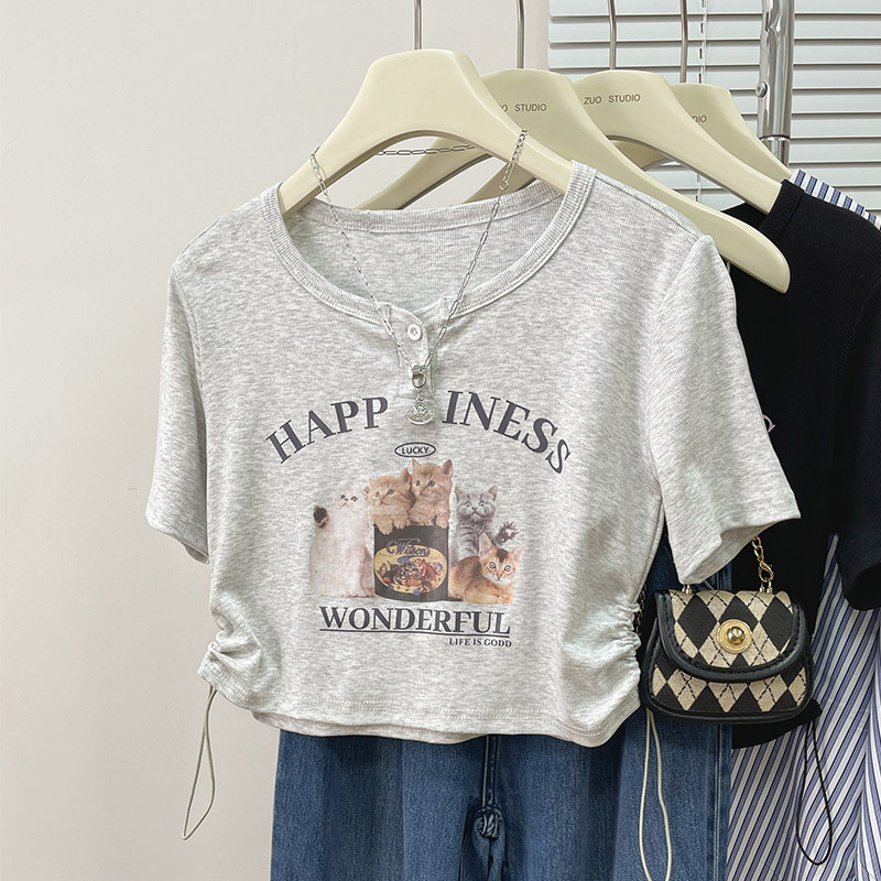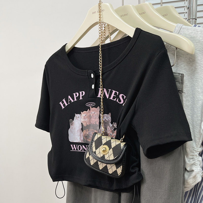 正肩短袖T恤女年夏季设计感小众美式印花甜辣短款修身上衣服