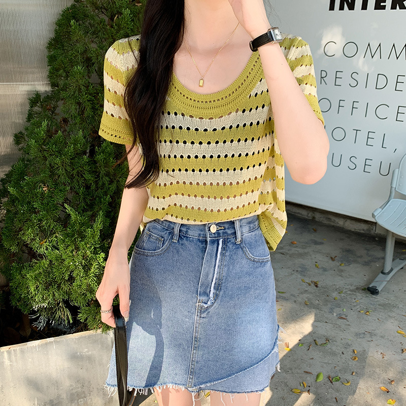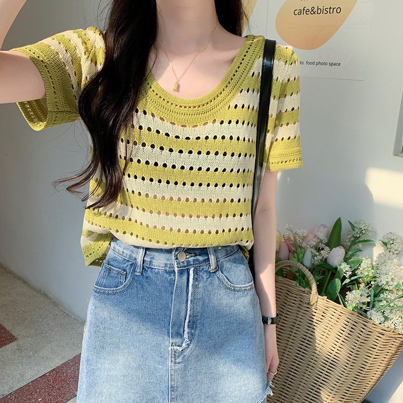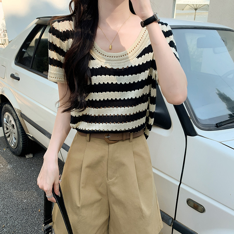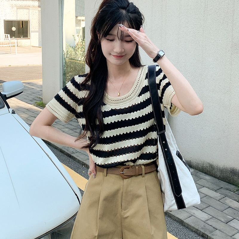 垂感半袖条纹T恤冰丝短袖针织衫女宽松韩版夏季新款上衣ins桖