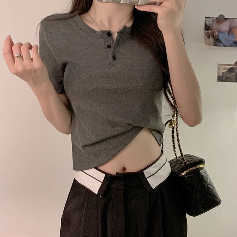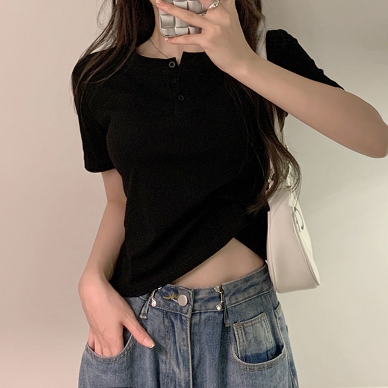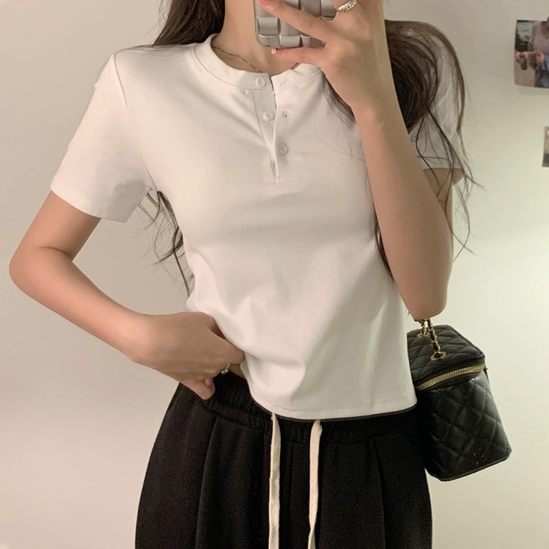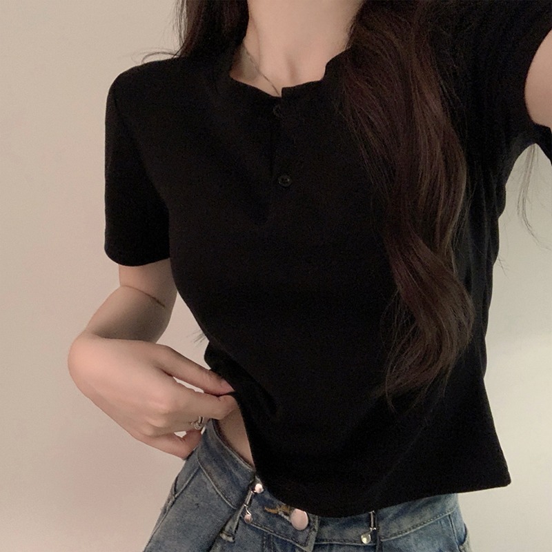 正肩T恤女装短袖修身高腰短款小个子纽扣体桖夏季新款上衣服ins潮
