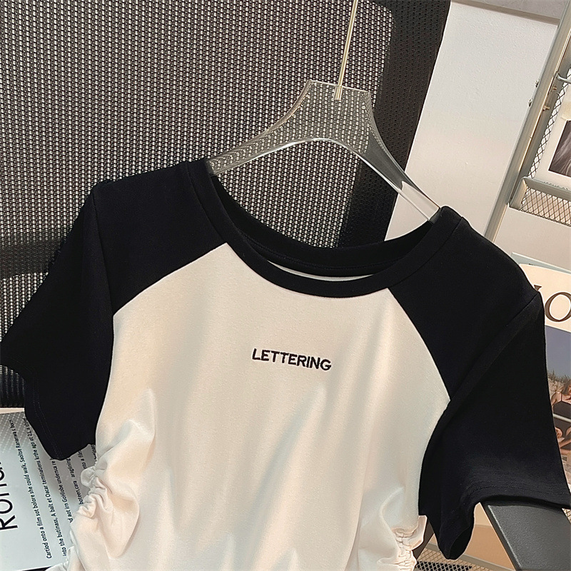 纯棉插肩短袖T恤女夏季新款设计感小众抽绳显瘦美式复古体桖上衣