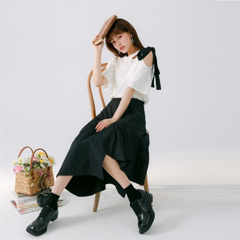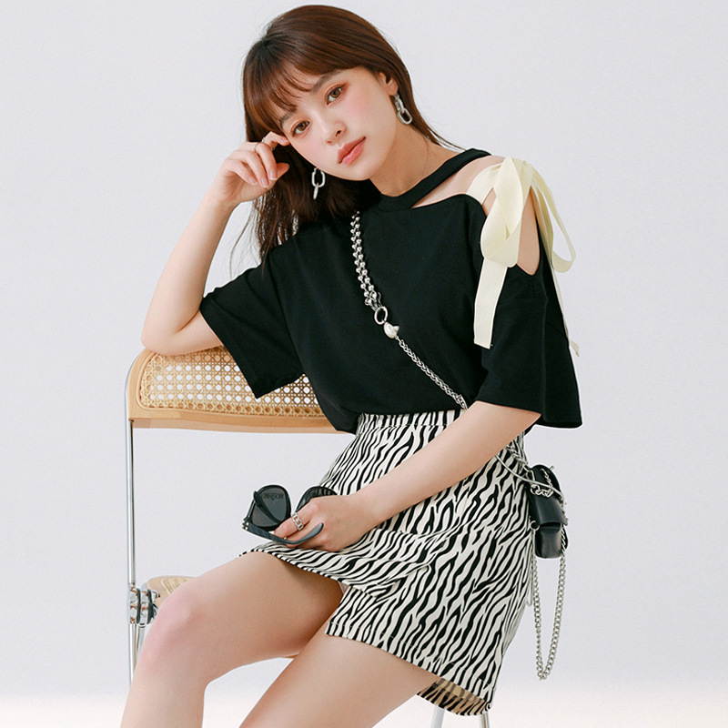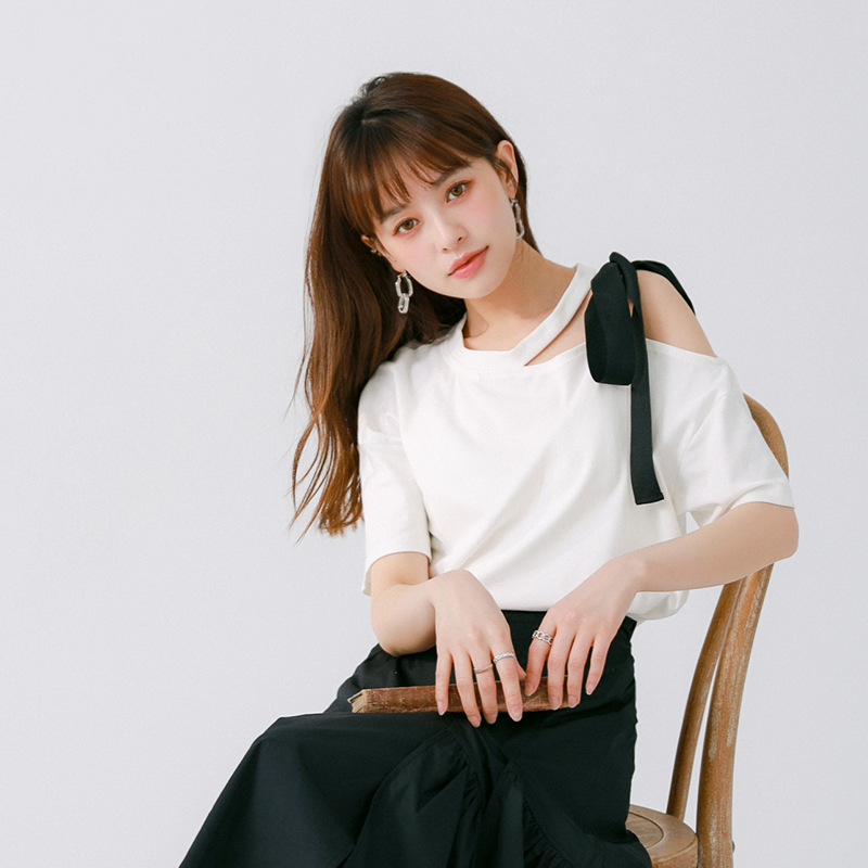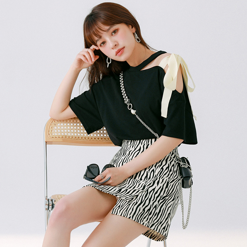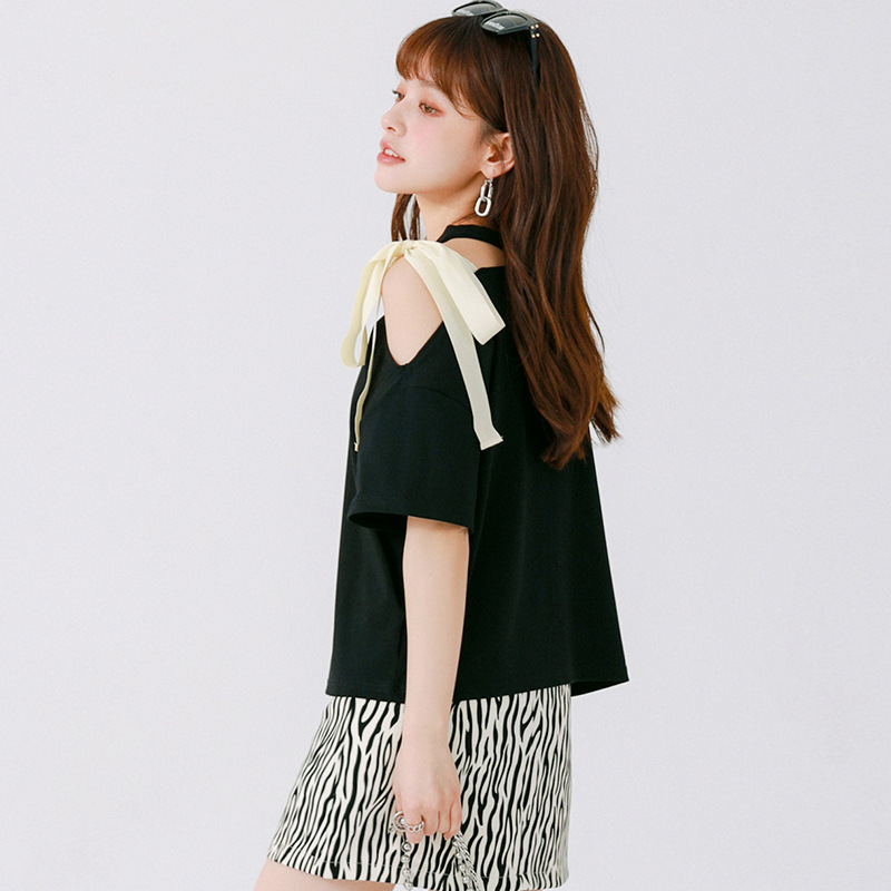 设计感小众露锁骨纯棉短袖t恤女夏季新款短款绑带蝴蝶结露肩上衣
