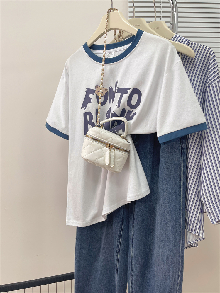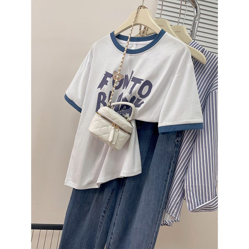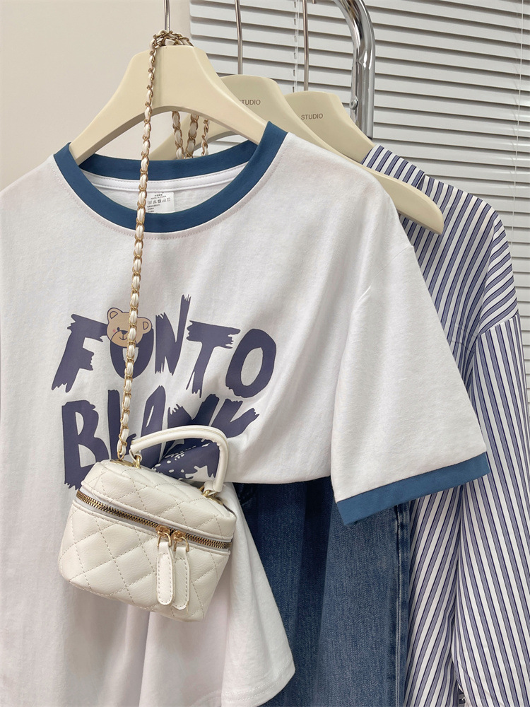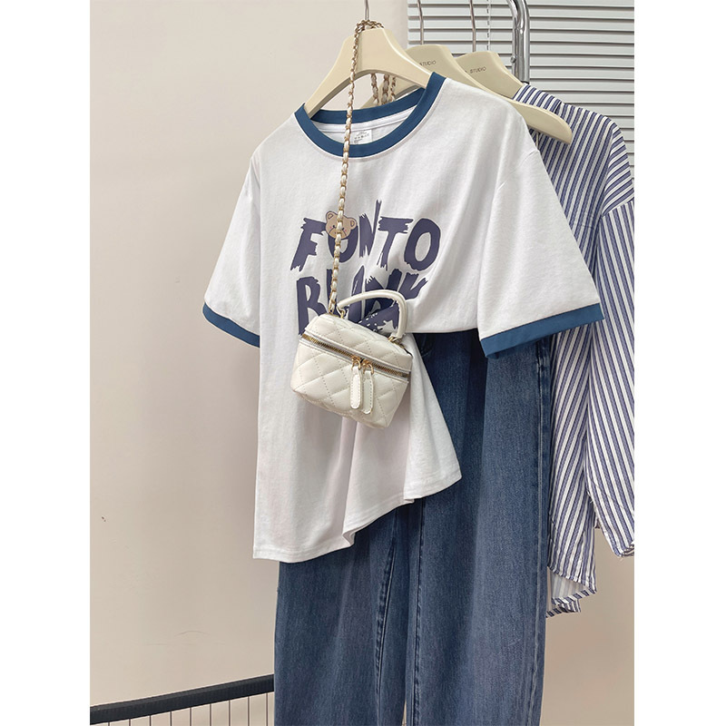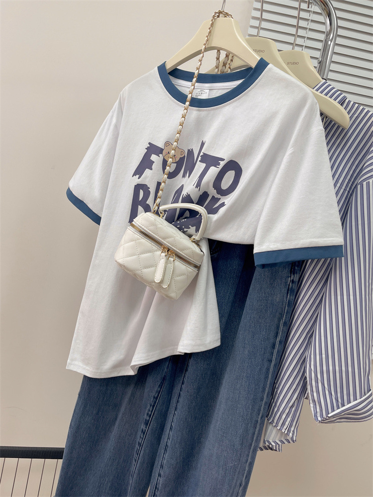 夏季宽松t恤女纯棉短袖设计感港味chic中长款正肩半袖撞色上衣服
