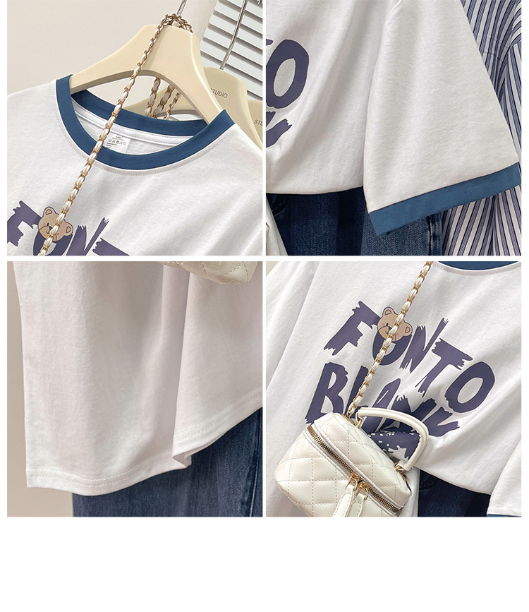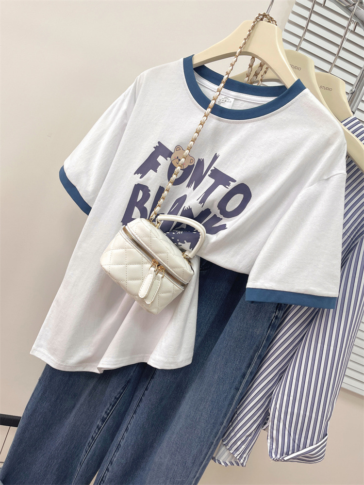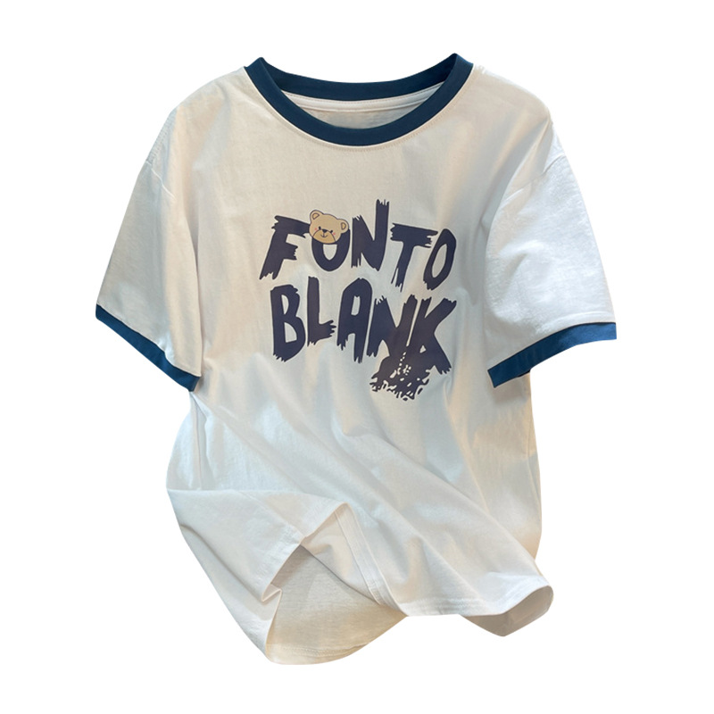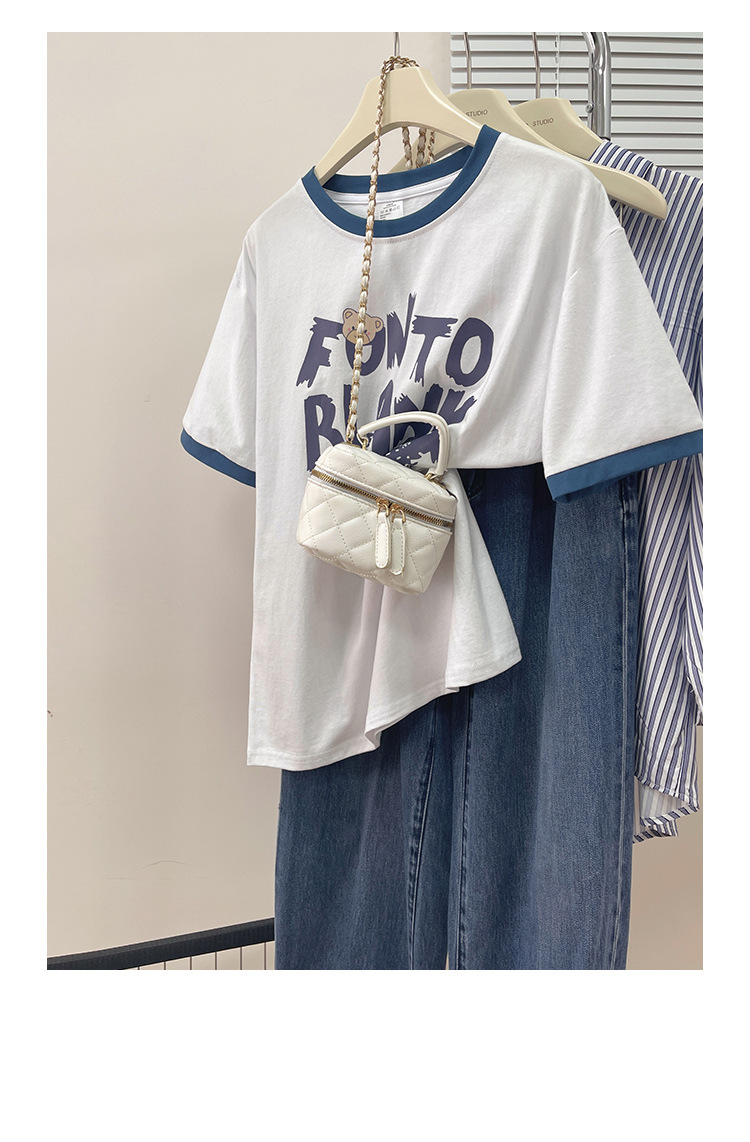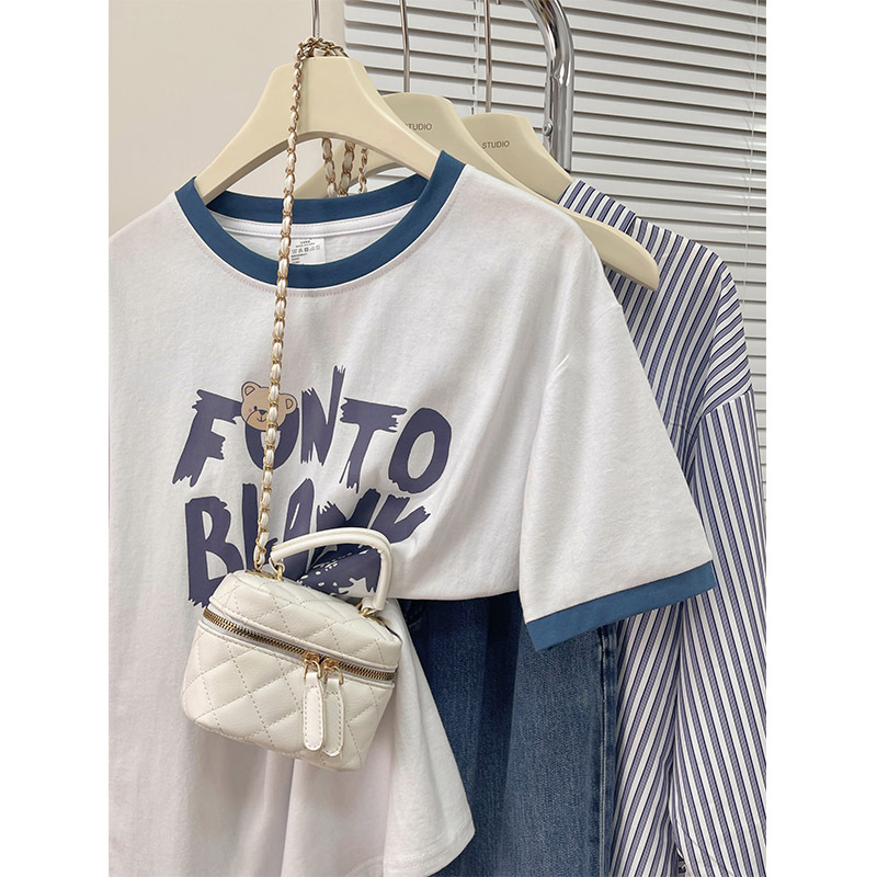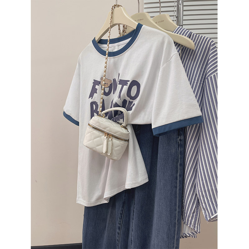 夏季宽松t恤女纯棉短袖设计感港味chic中长款正肩半袖撞色上衣服
