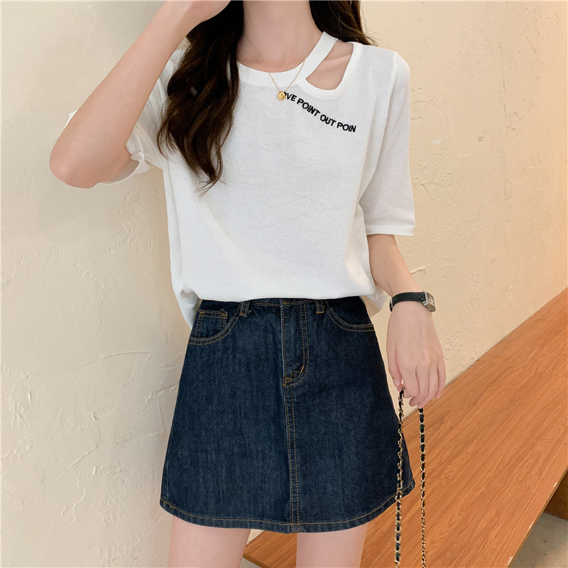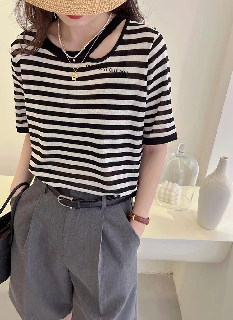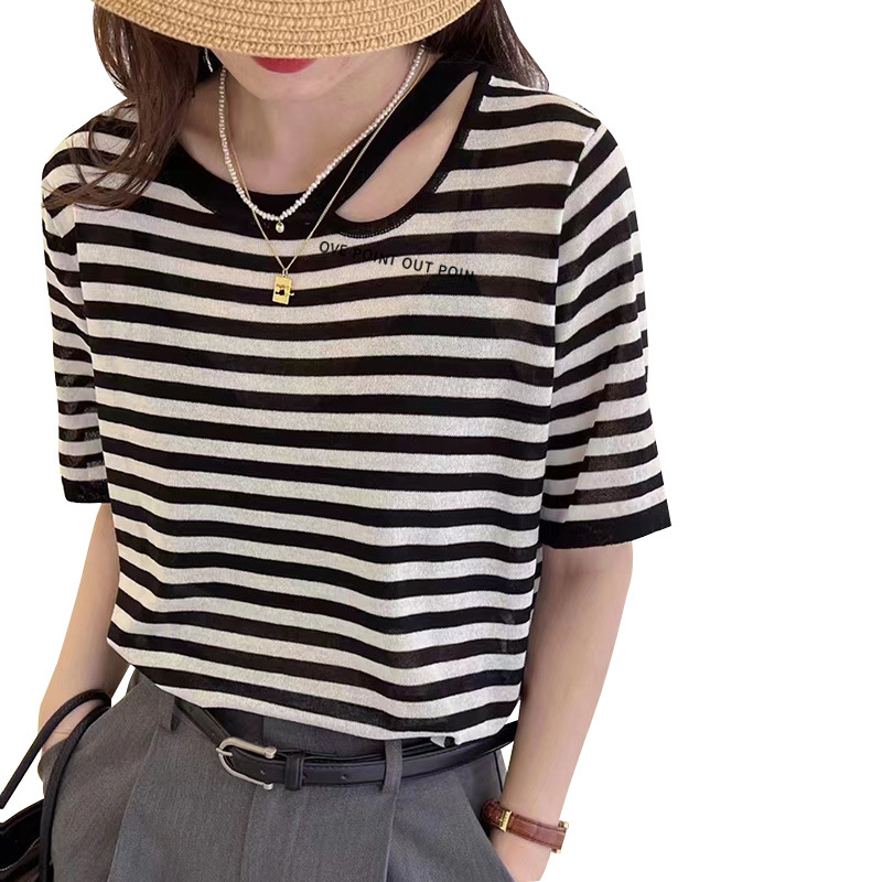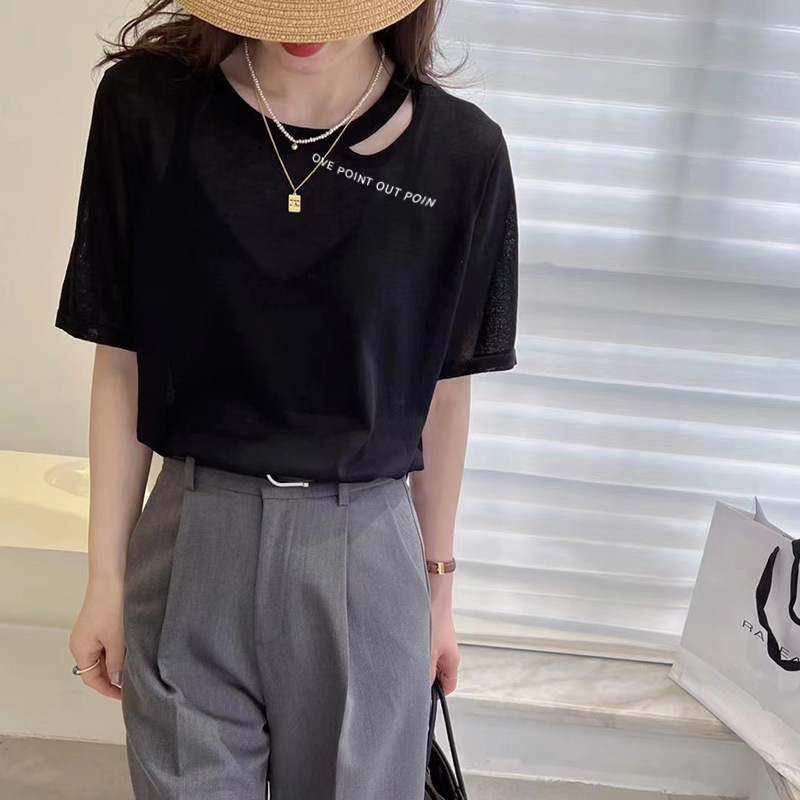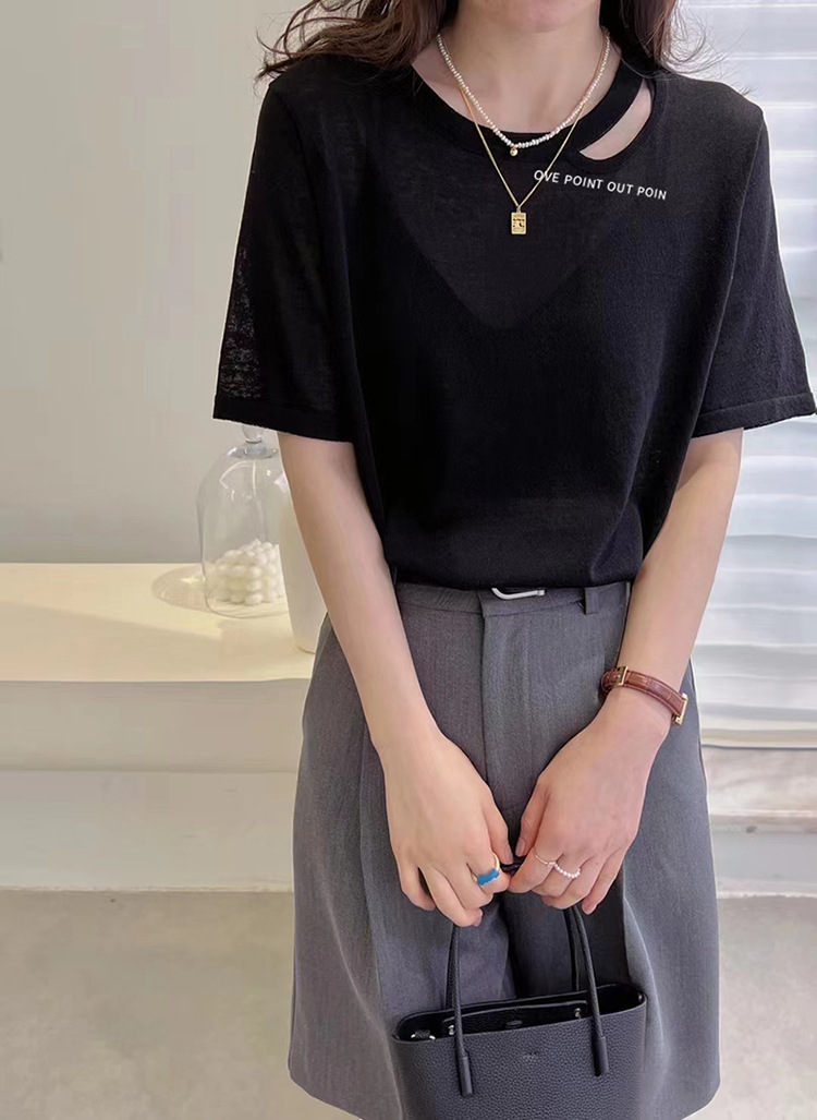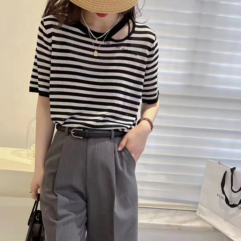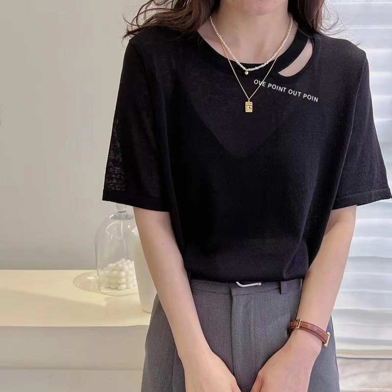 夏季薄款冰丝短袖针织衫女宽松设计感小众半袖镂空T恤新款上衣服