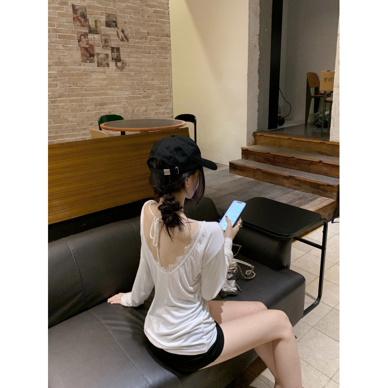 同行盗图必究,厂家实拍 纯欲风蕾丝花边v领长袖T恤女宽松休闲打