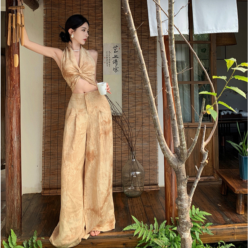实拍设计感时尚两件套女夏季新款无袖挂脖上衣+阔腿拖地长裤