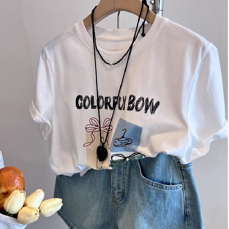 纯棉短袖t恤女夏季新款宽松小个子百搭圆领法式甜辣风上衣ins