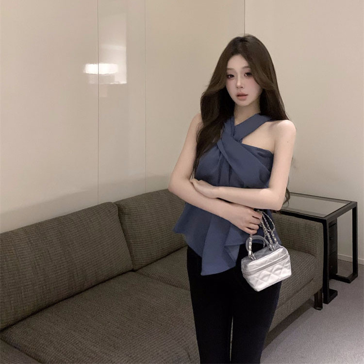 蓝色缎面挂脖小吊带背心女夏季设计感小众气质不规则修身无袖上衣