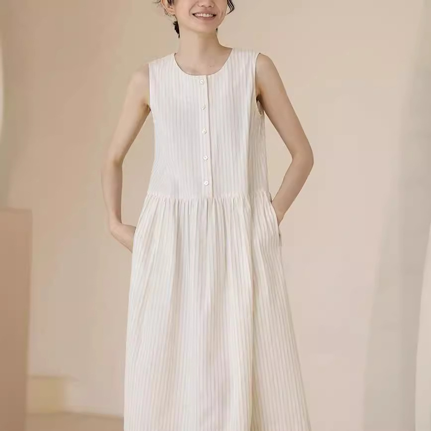 夏季新款清新藤条色织条纹盐缩工艺肌理宽松背心连衣裙