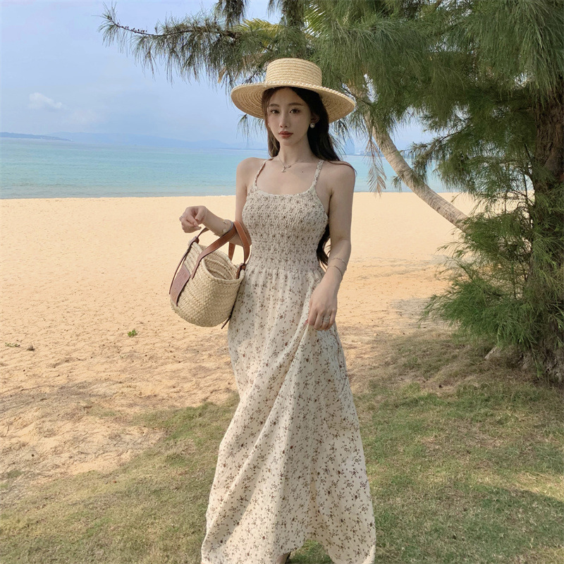 夏季新款女装法式复古黑色碎花吊带连衣裙淑女气质显瘦露背长裙子