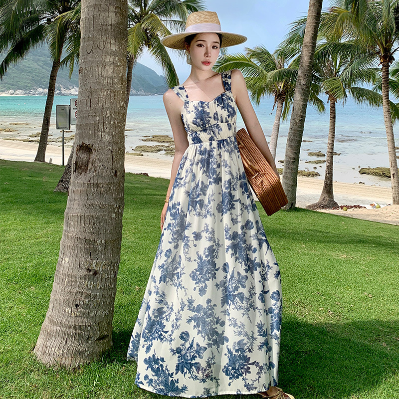 法式度假风吊带无袖收腰蓝色印花长裙拖地裙