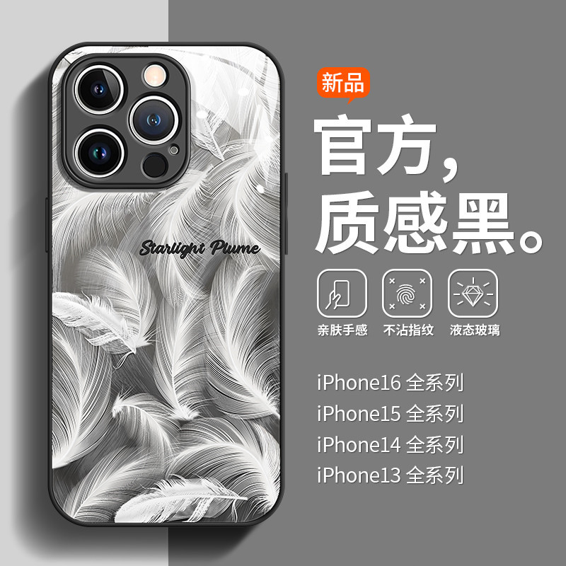 适用于苹果15Pro手机壳羽毛商务全包iphone16玻璃羽纱情侣防摔12
