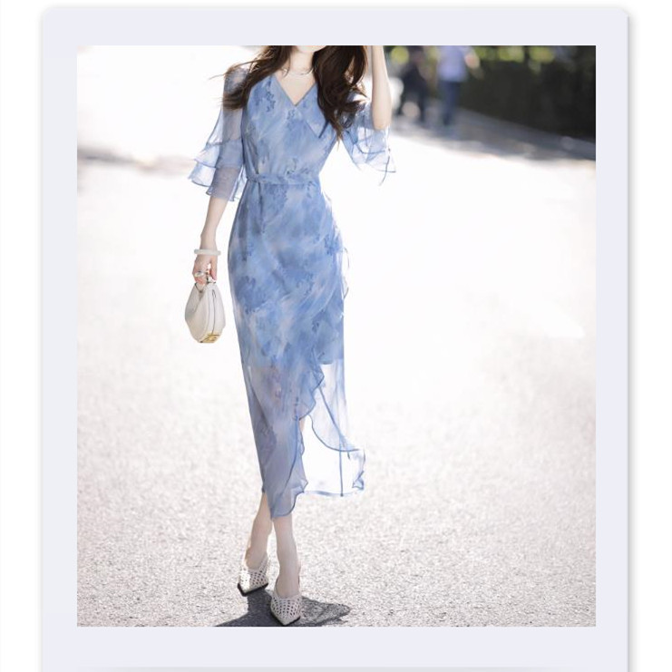 |夏天的风|荷叶边蓝色仙女裙新款小清新雪纺连衣裙