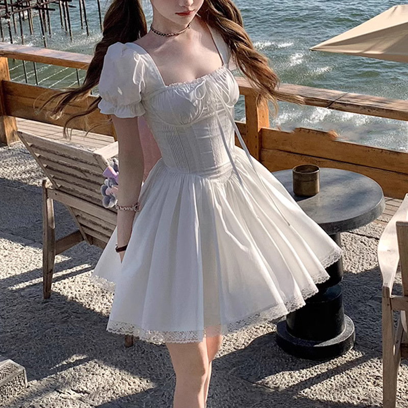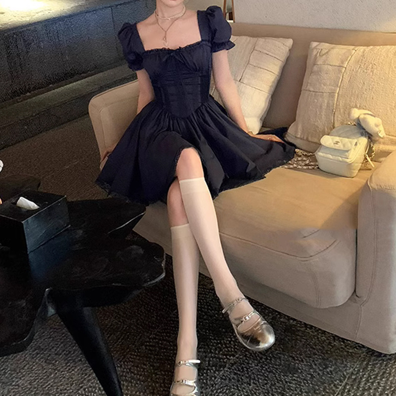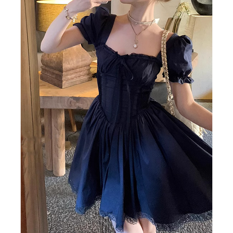 芭蕾赞歌 方领泡泡袖绑带鱼骨连衣裙女 短袖版/两色