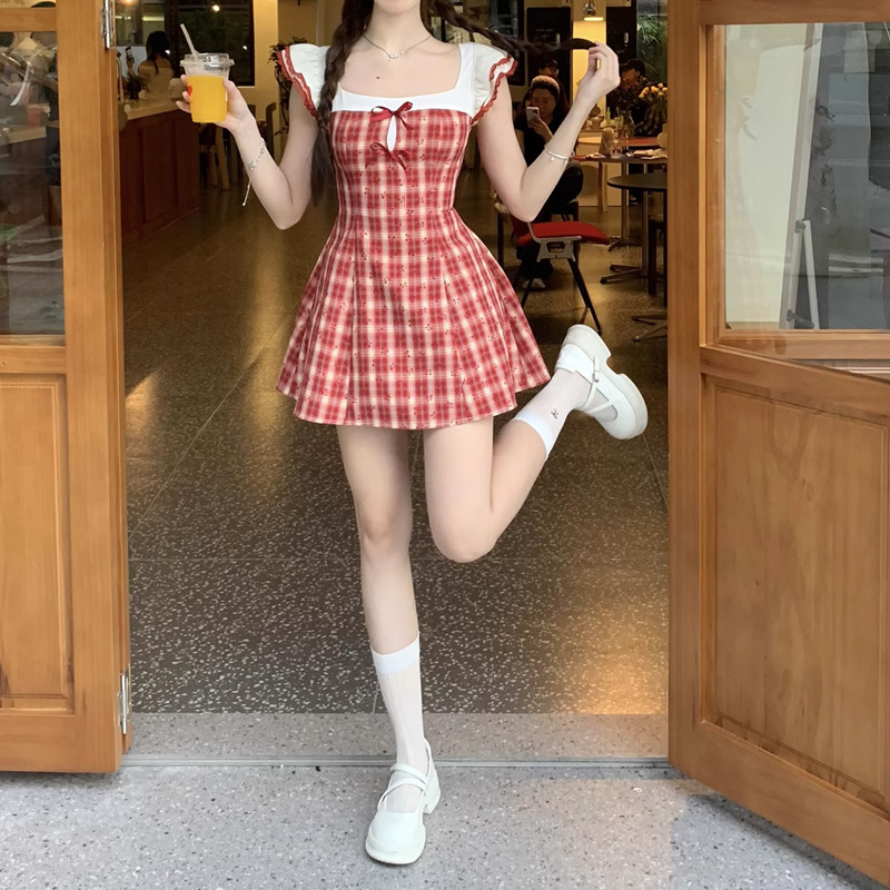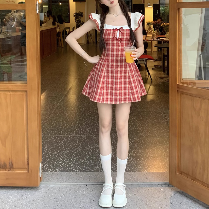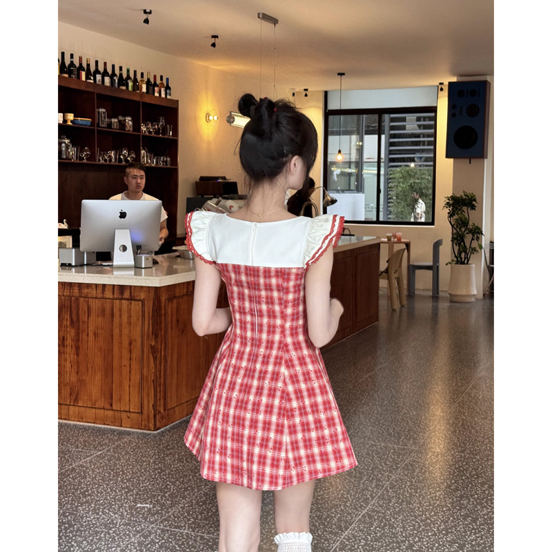 红格物语 显瘦气质复古红格纹小飞袖公主连衣裙夏季