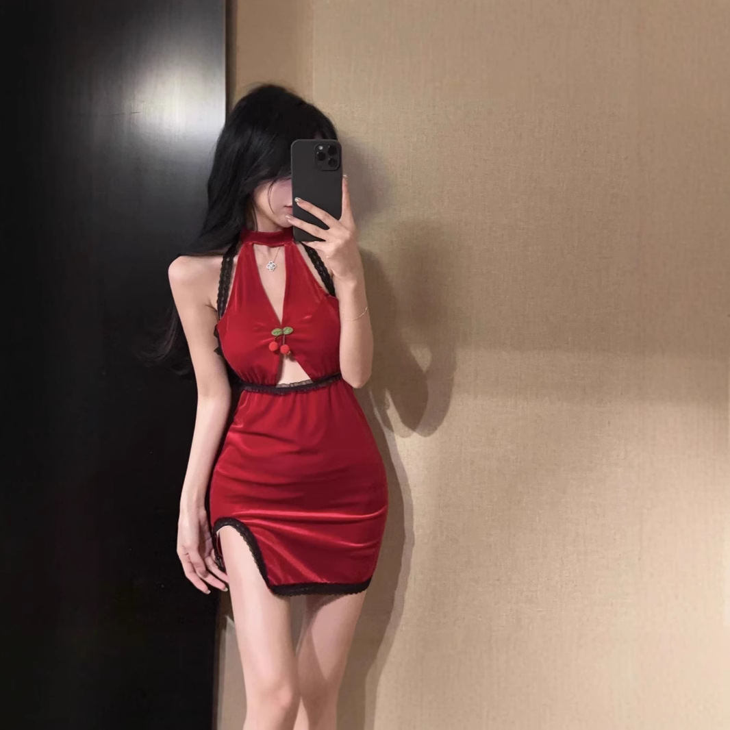 设计感气质纯欲性感大露背红色无袖丝绒辣妹修身包臀圣诞连衣裙女
