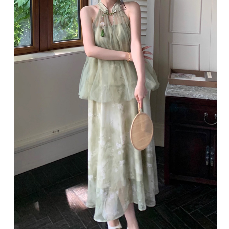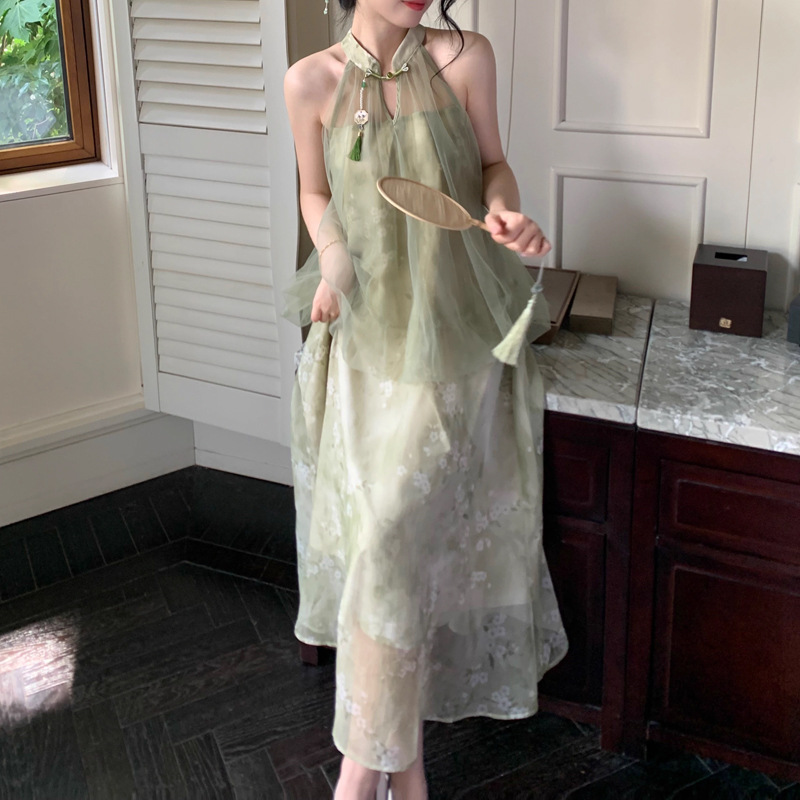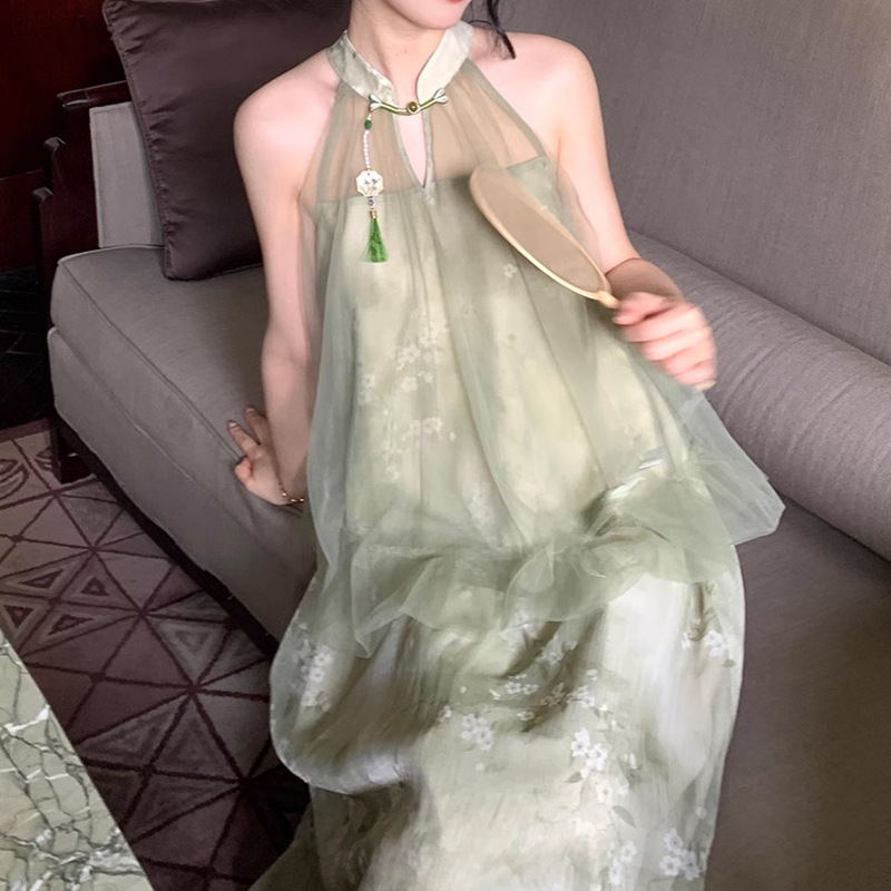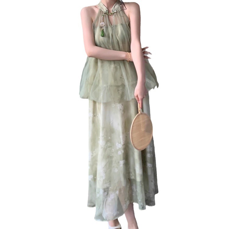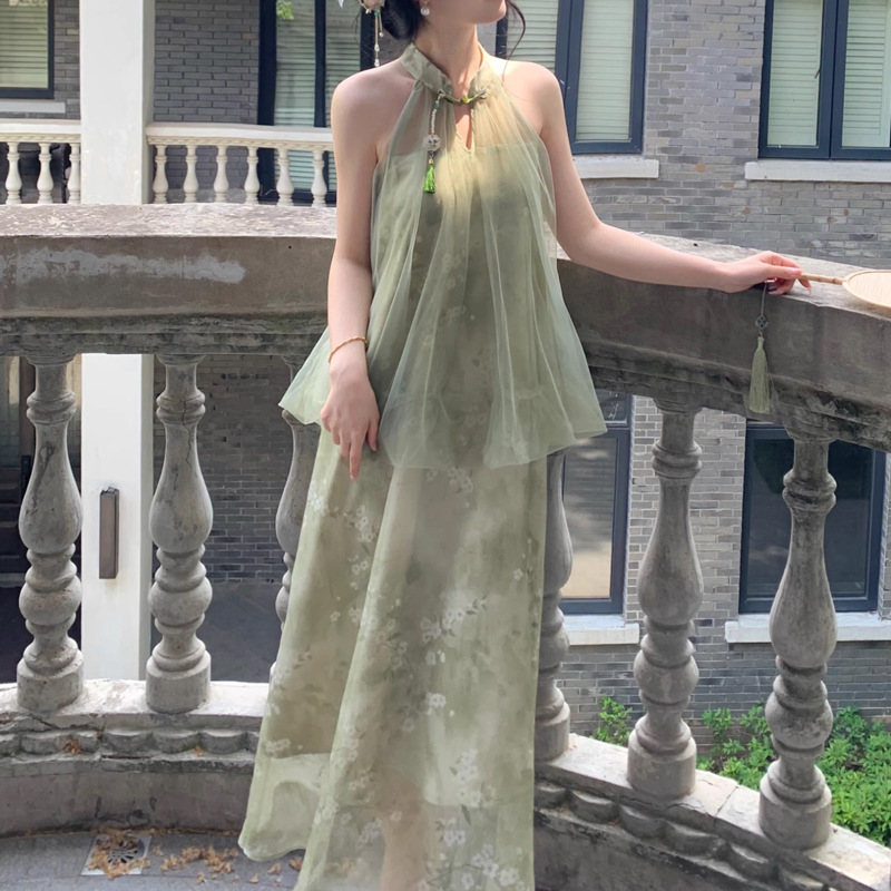 半夏晴海 仙气网布印花宽松假两件新中式复古挂脖连衣裙